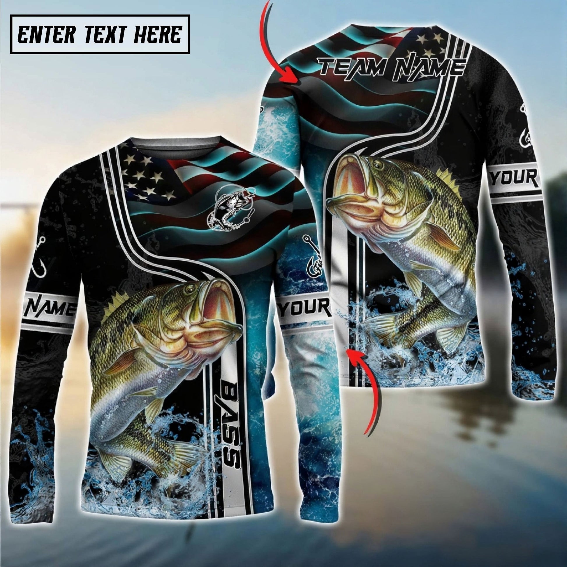 Bluejose Bass Jumping Fish American Flag Wave Splash Custom Name & Team Name 3D Shirts