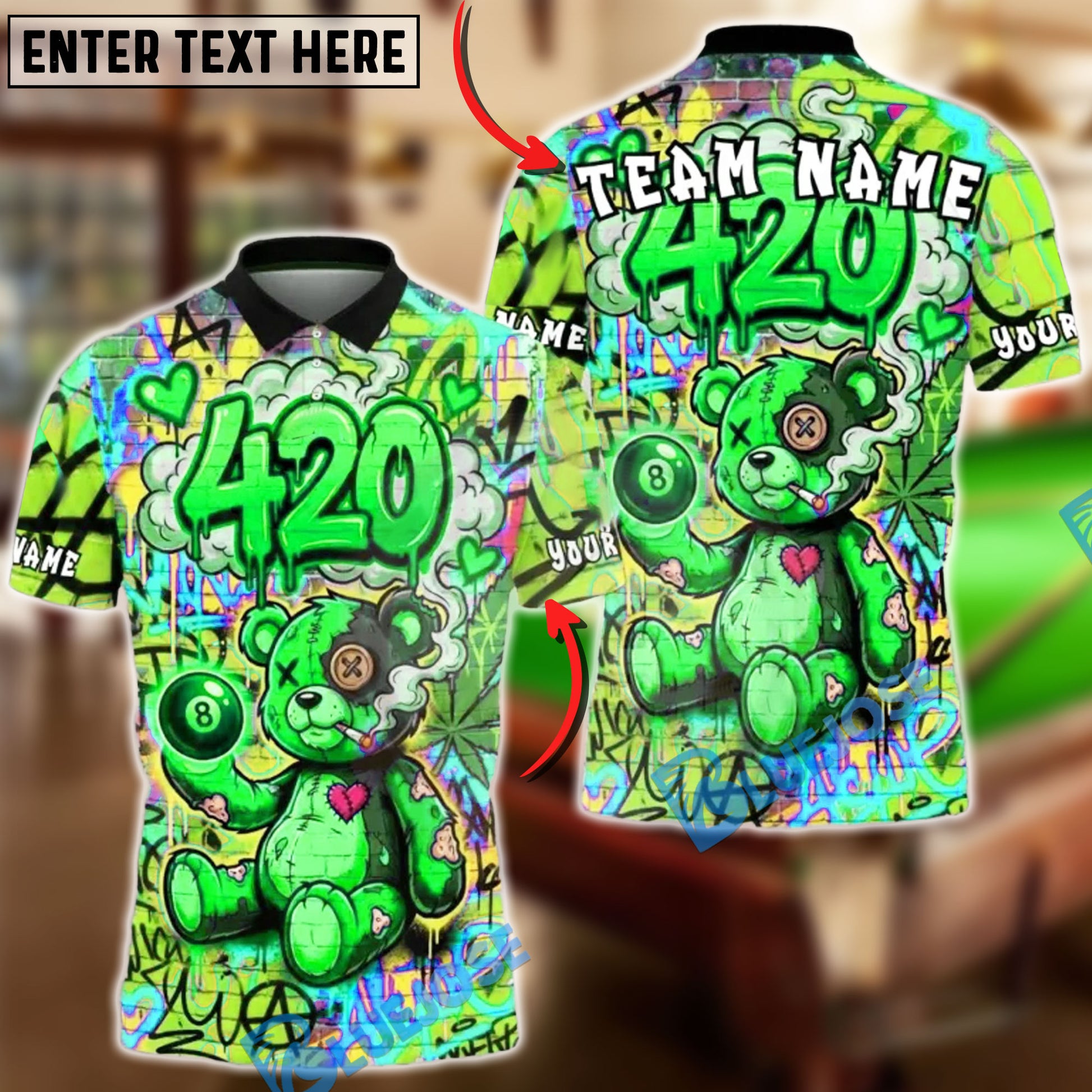 BlueJose Billiards 8-Ball 420 Bear Graffiti Rainbow Personalized Name, Team Name Unisex Shirt (4 Colors)