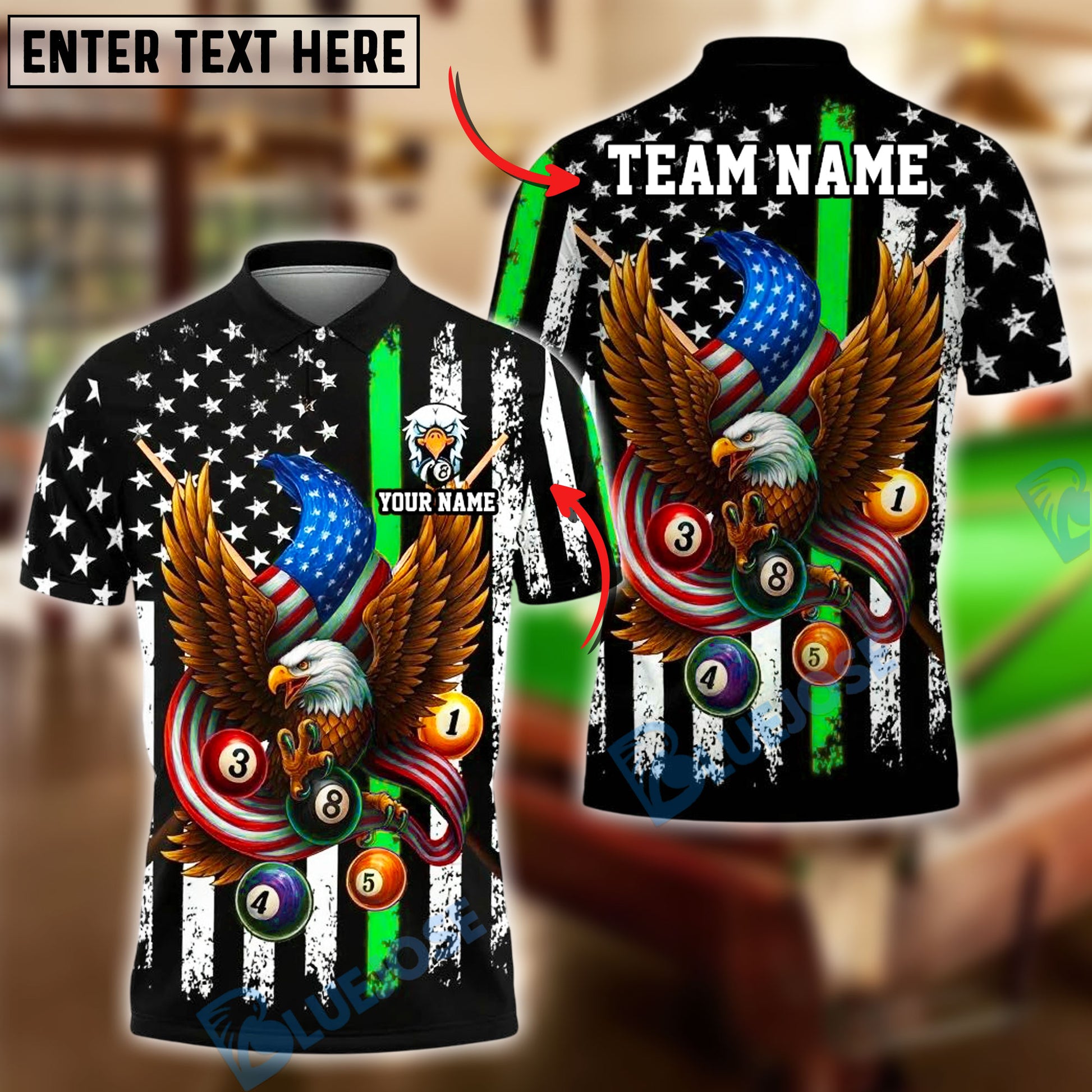 BlueJose Billiards 8 Ball Eagle American Flag Stripes Personalized Name, Team Name Unisex Shirt (4 Colors)