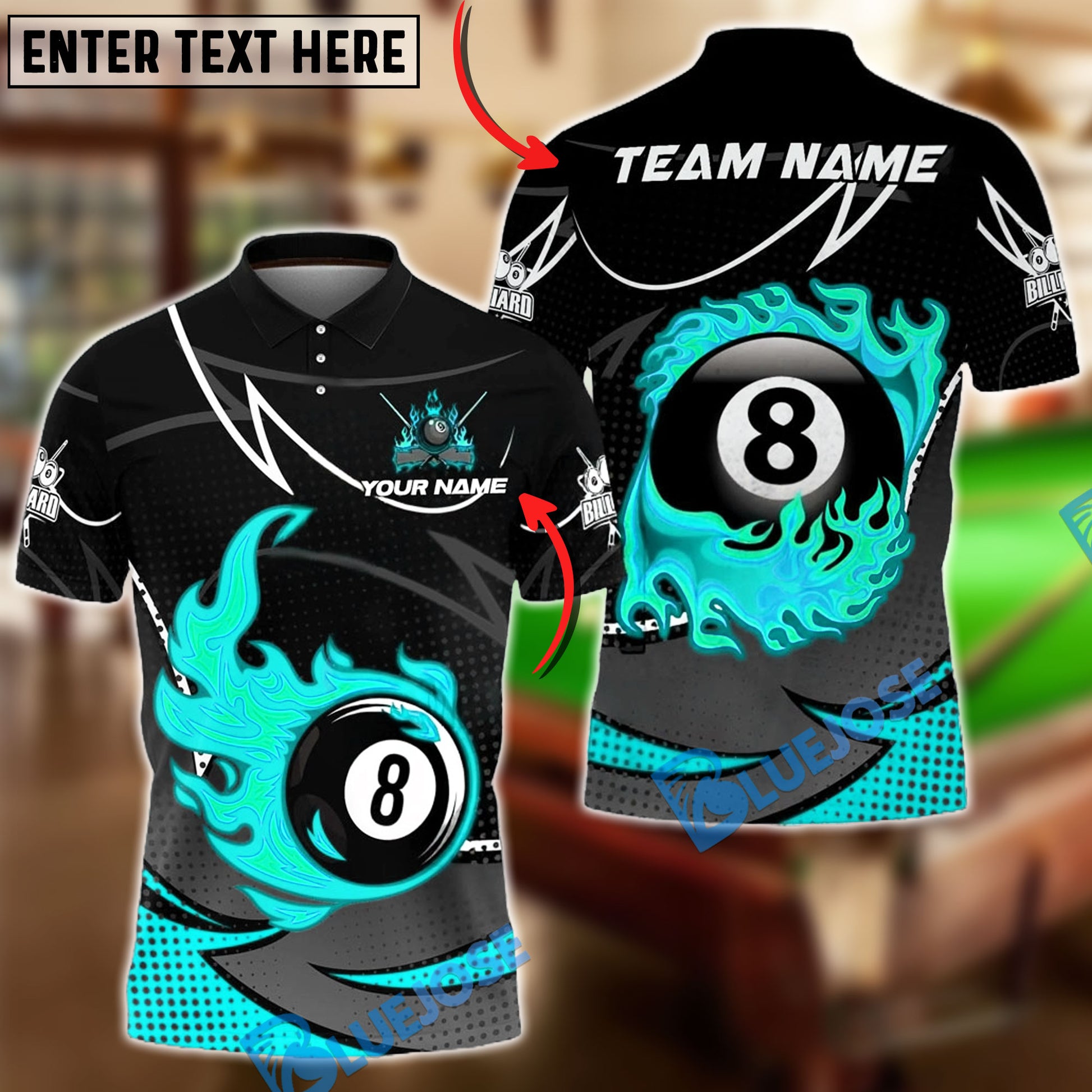 BlueJose Billiards 8-Ball Flaming Fire Dot Personalized Name, Team Name Unisex Shirt (4 Colors)