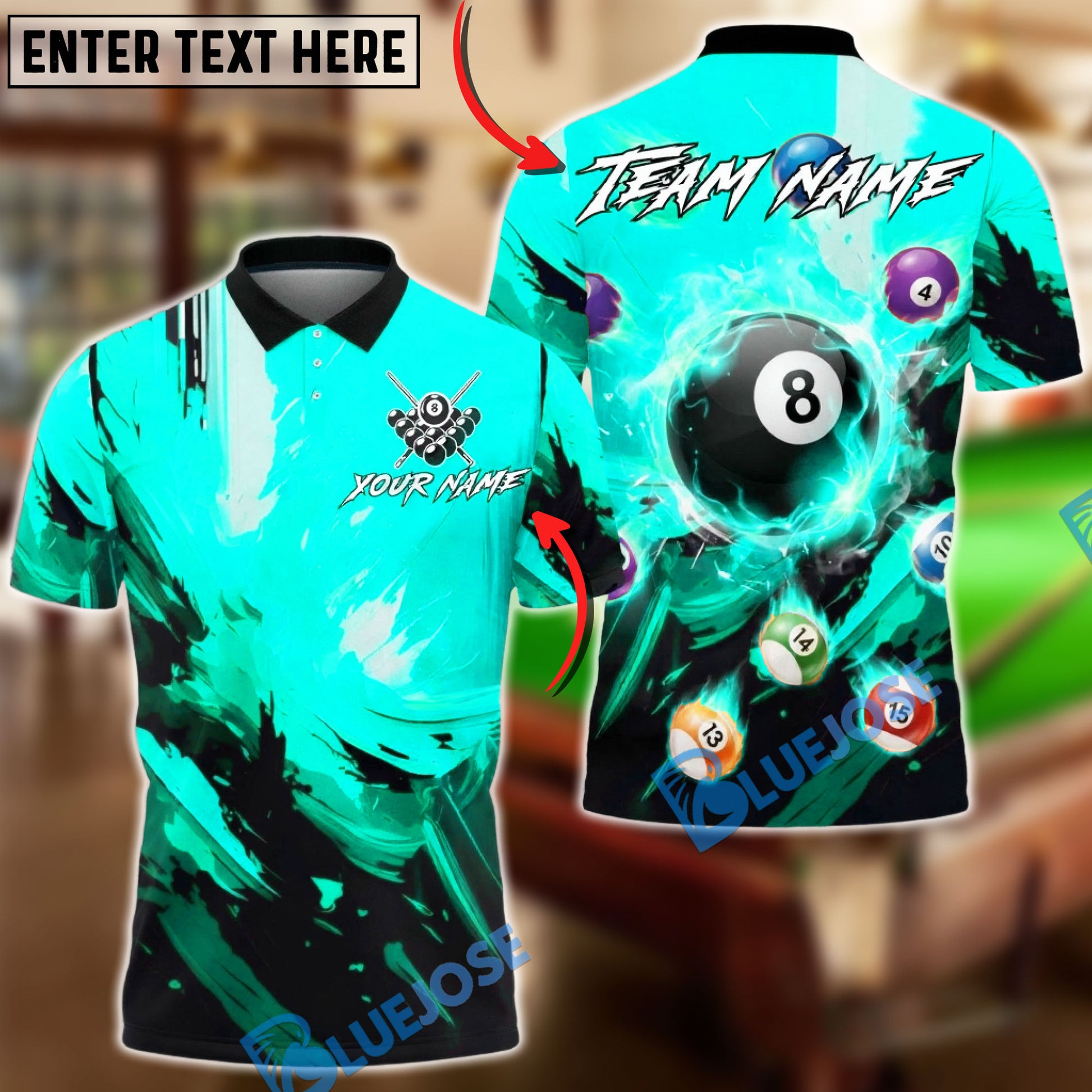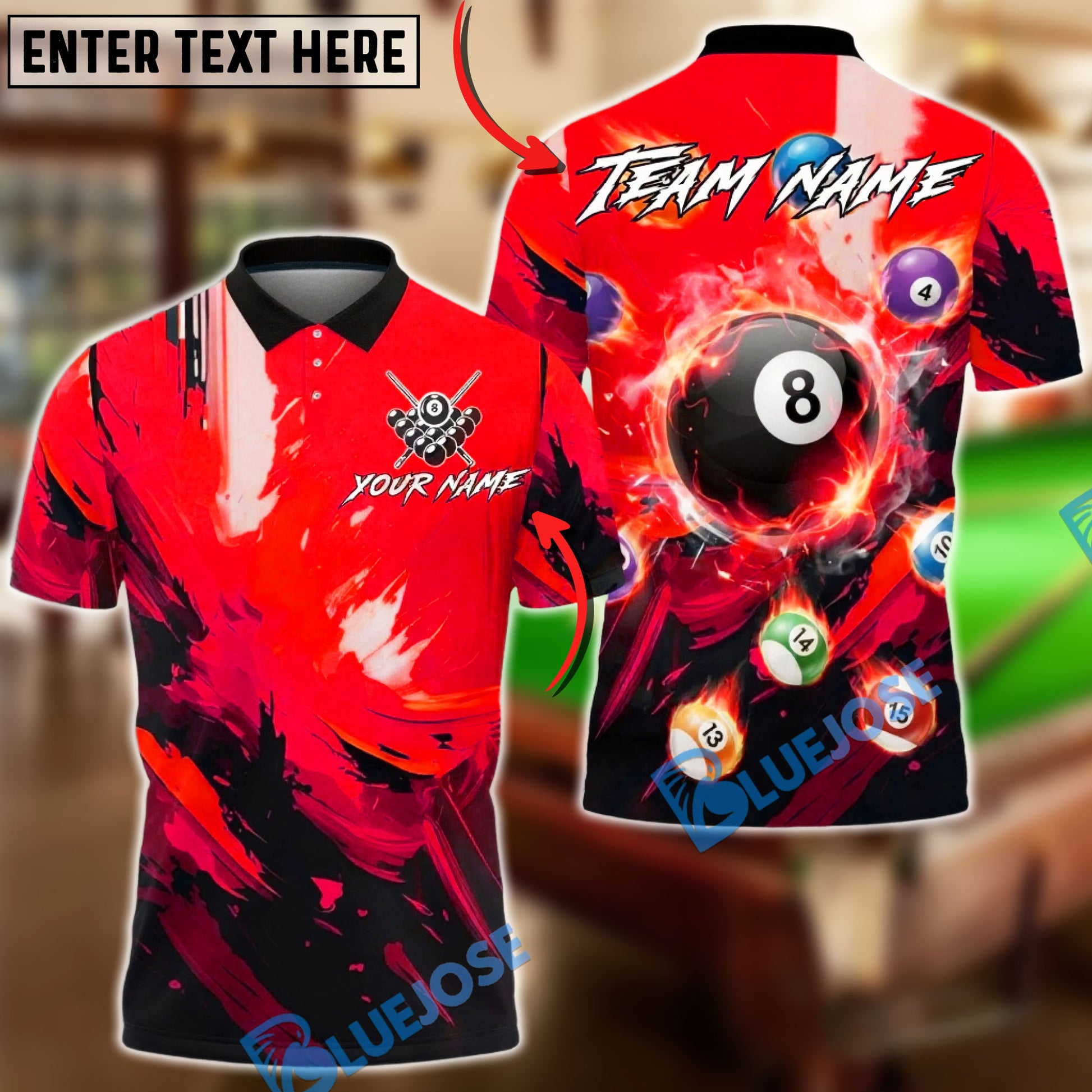 BlueJose Billiards 8-Ball Flaming Grunge Personalized Name, Team Name Unisex Shirt (6 Colors)