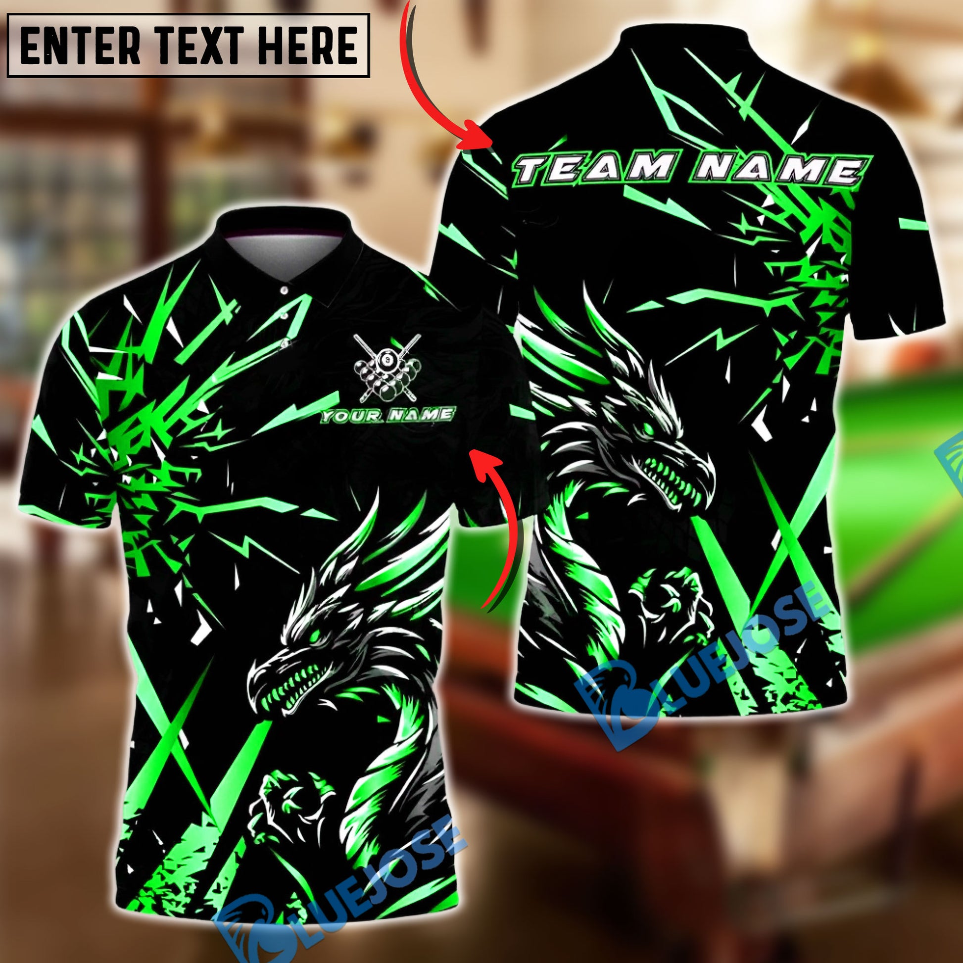 BlueJose Billiards 8-Ball Golden Dragon Black Lightning Strike Customized Name, Team Name 3D Shirt (6 Colors)
