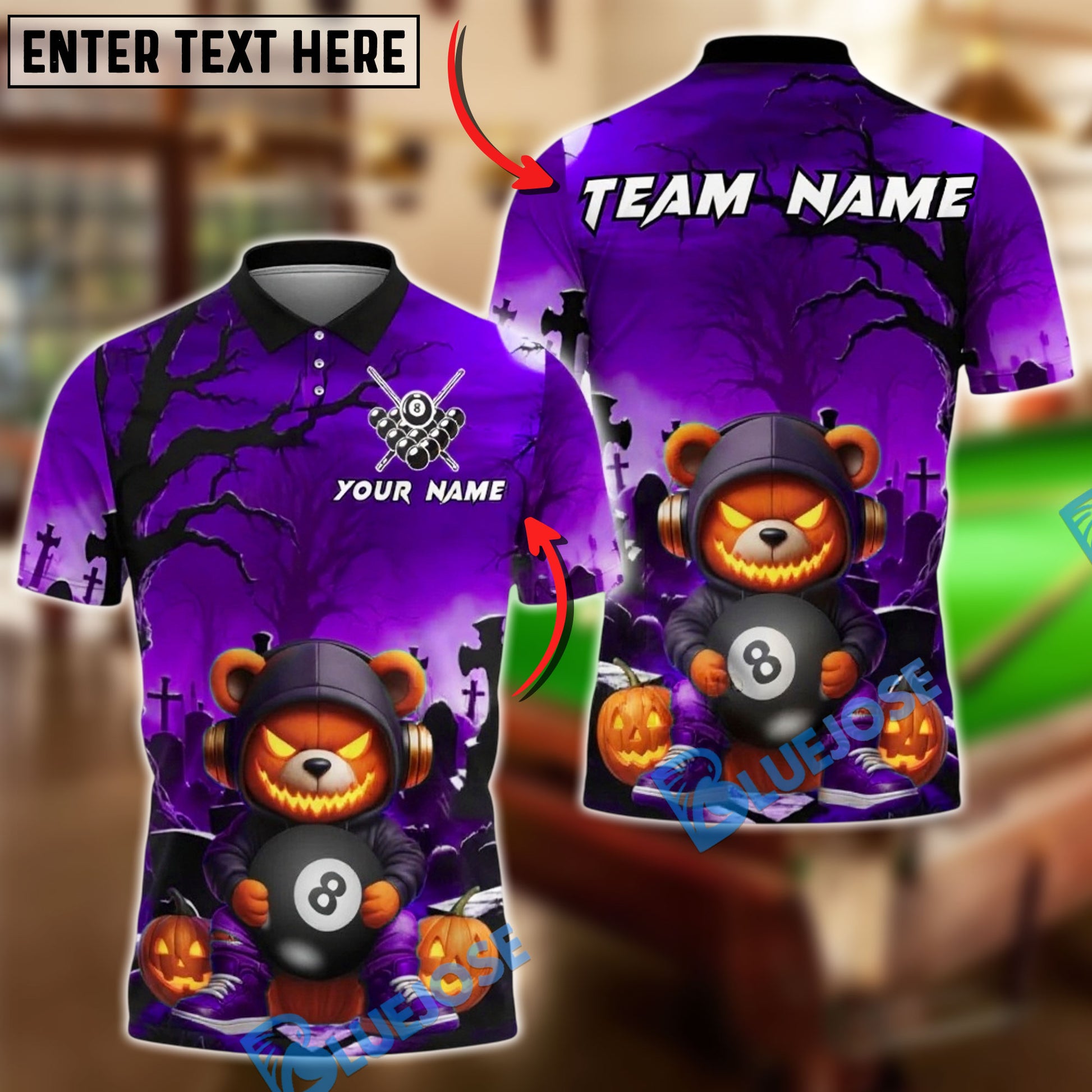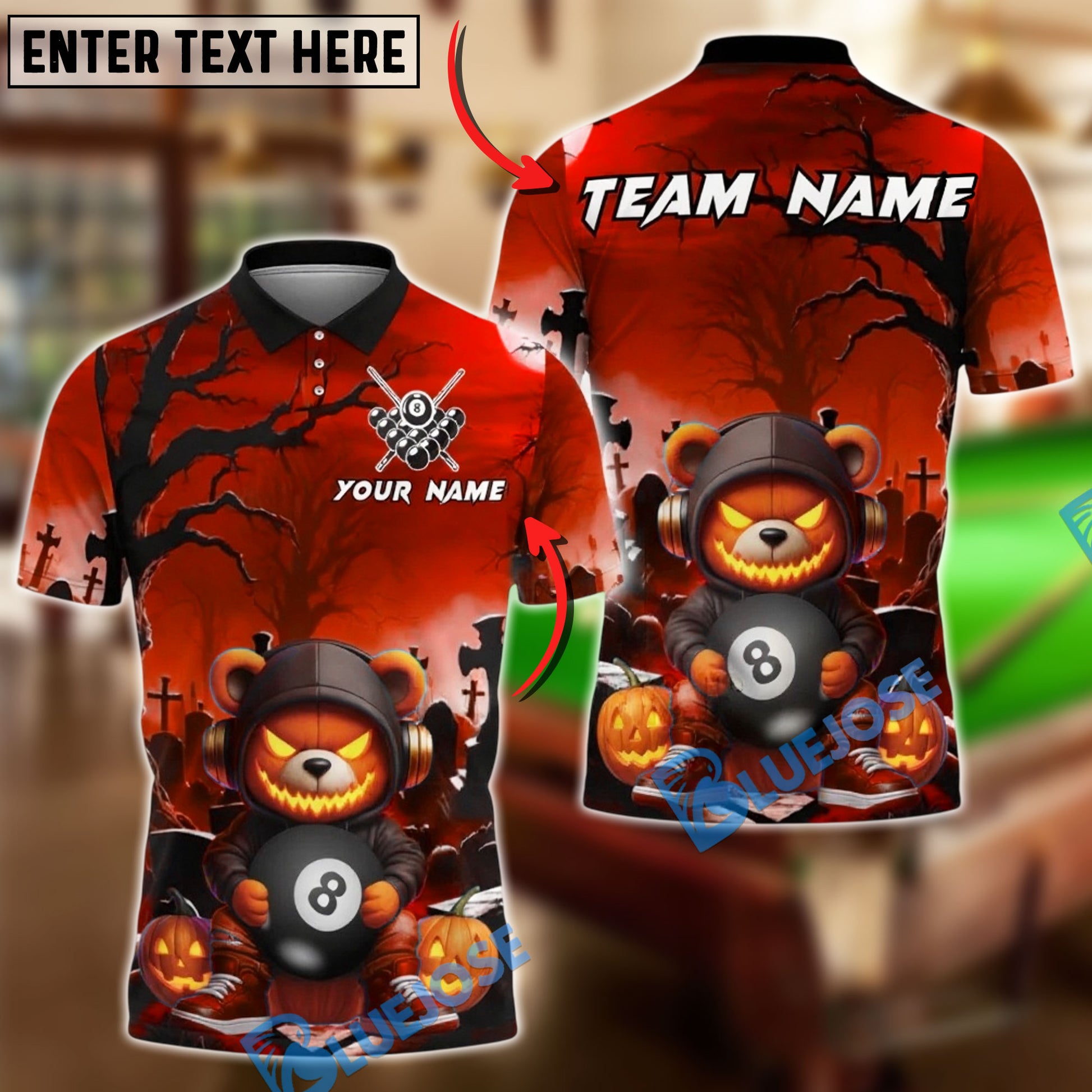 BlueJose Billiards 8 Ball Halloween Bear Pumpkin Personalized Name, Team Name Unisex Shirt (4 Colors)