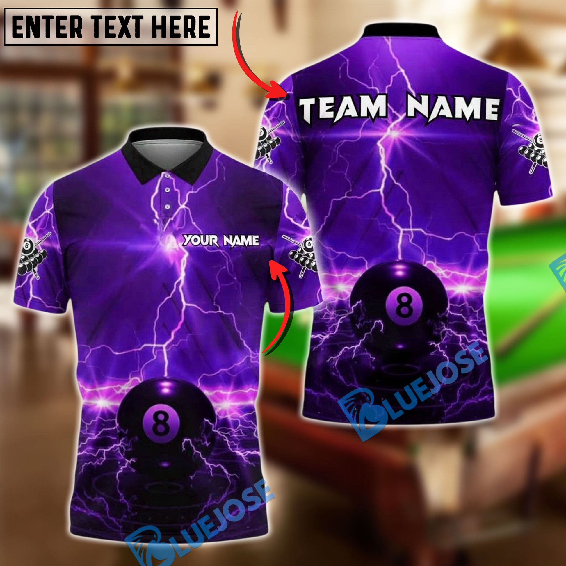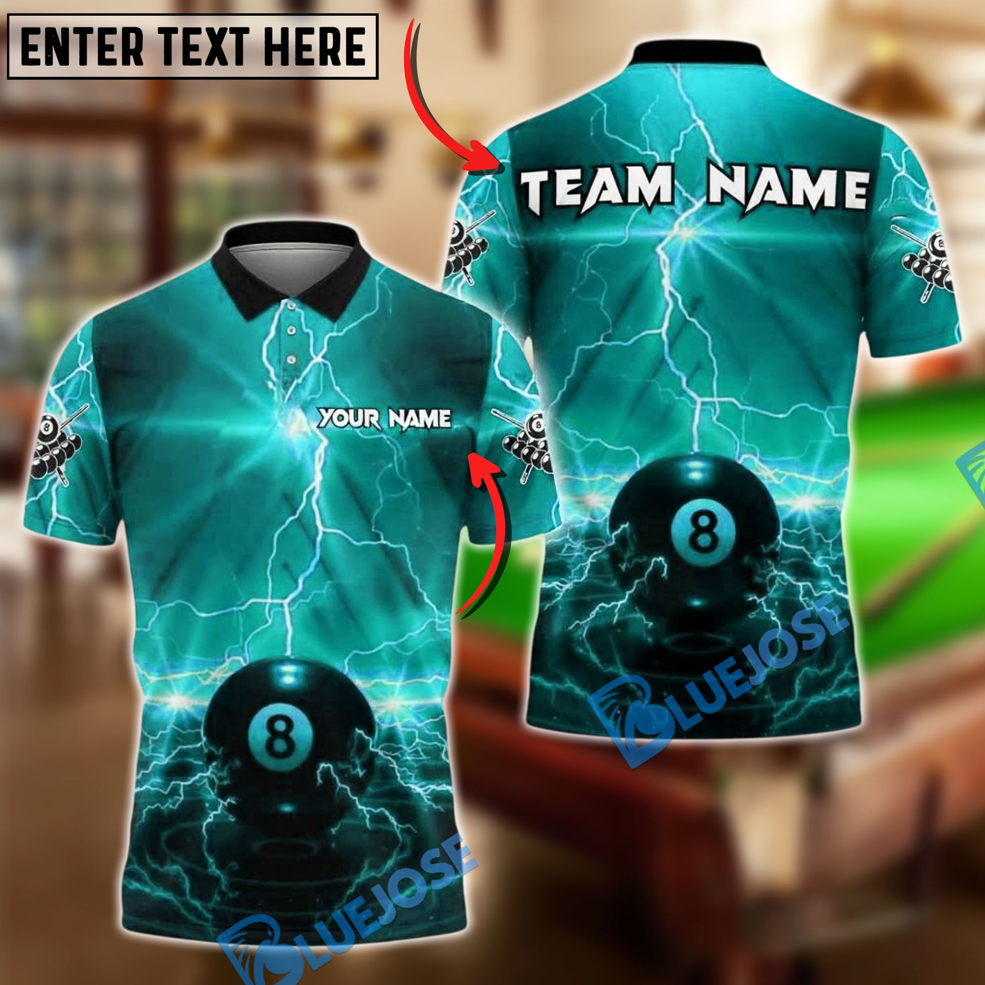 BlueJose Billiards 8 Ball Lightning Glow Storm Personalized Name, Team Name Unisex Shirt (4 Colors)