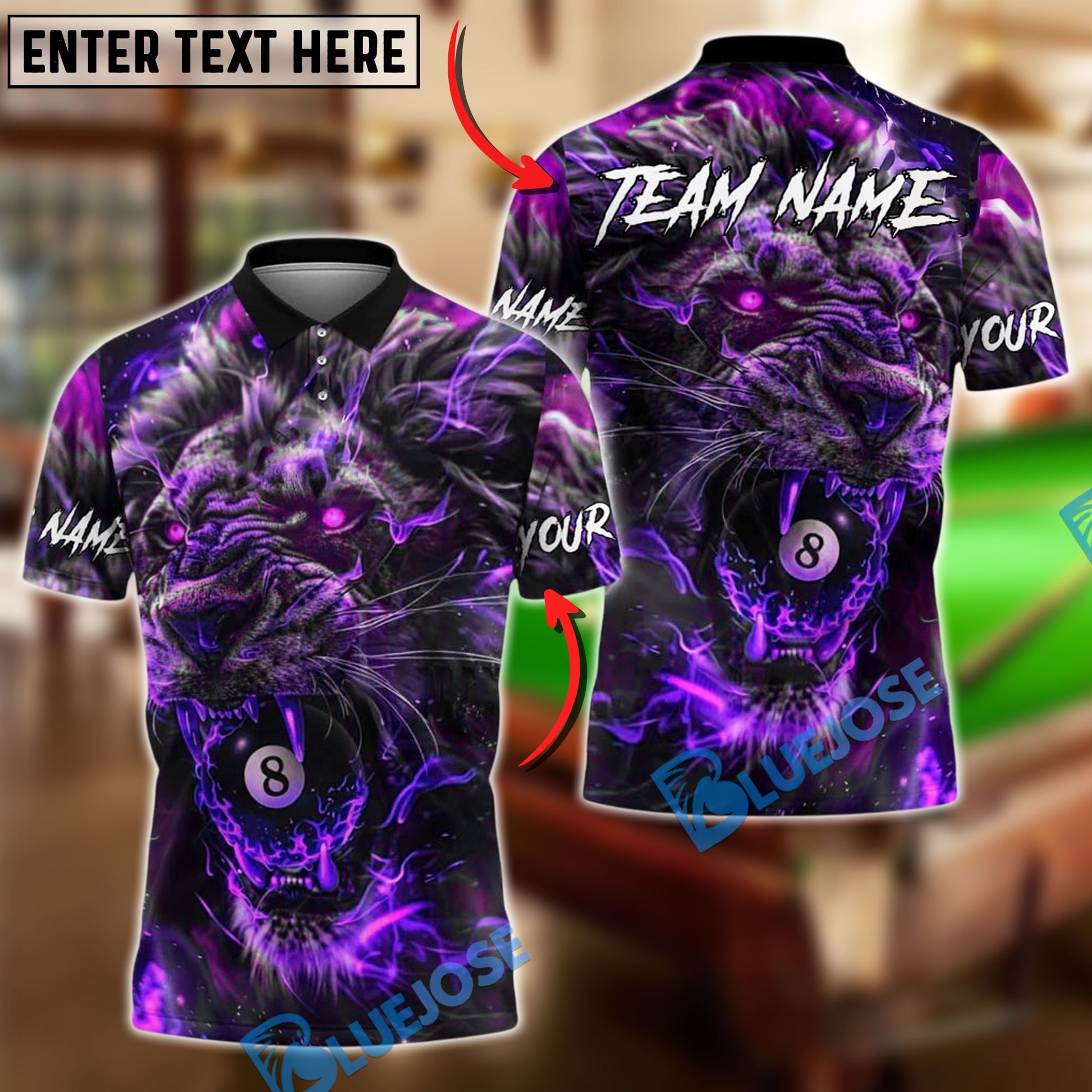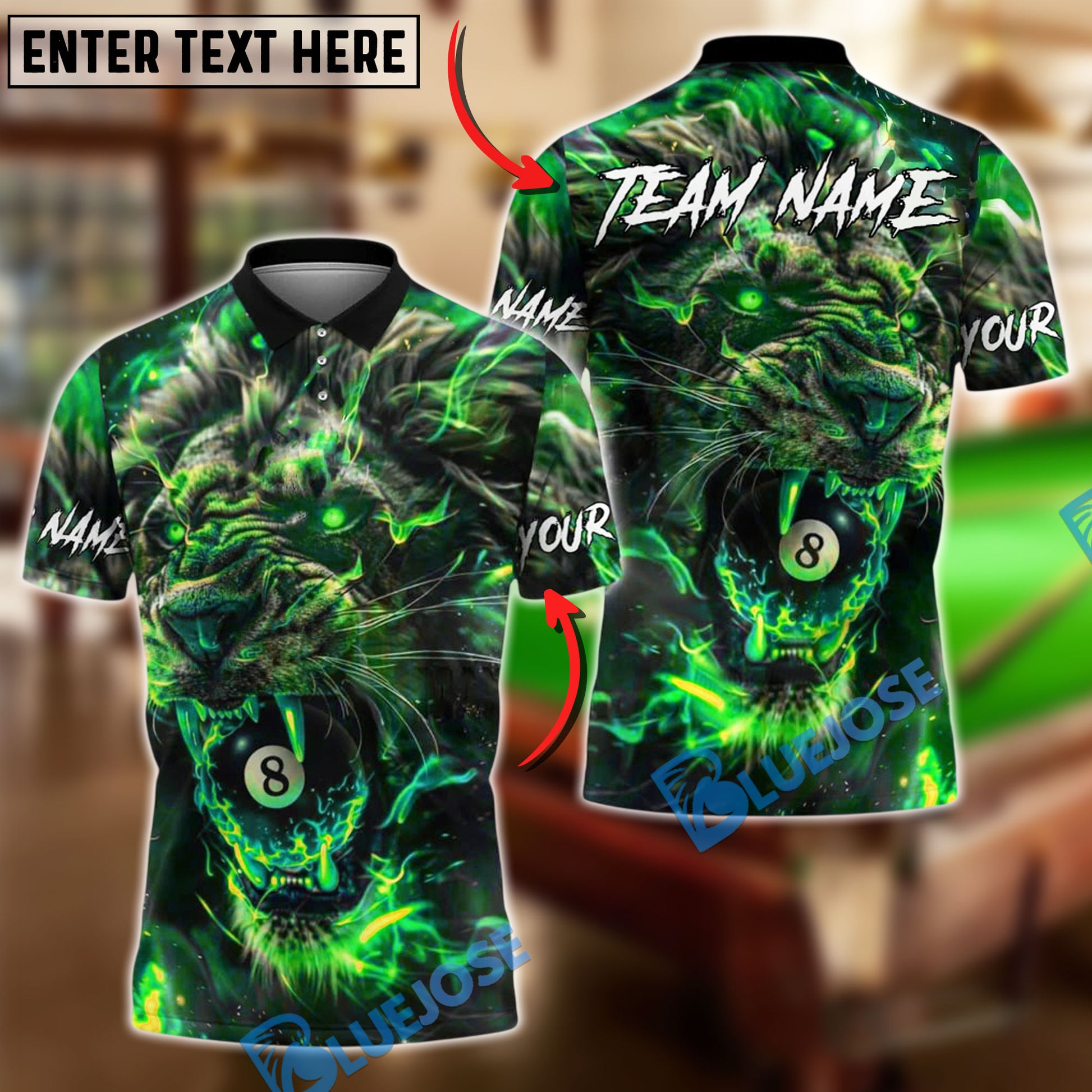 BlueJose Billiards 8 Ball Lion Fire Glow Personalized Name, Team Name Unisex Shirt (4 Colors)