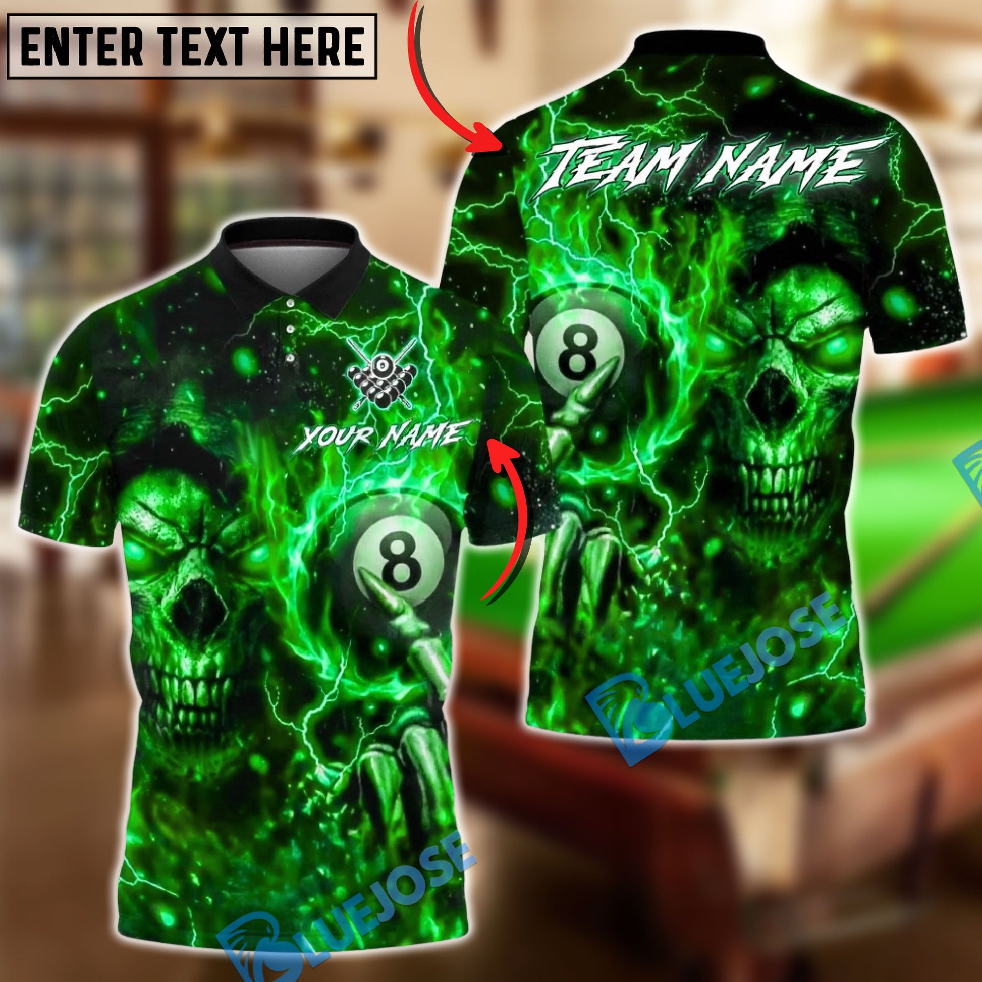 BlueJose Billiards 8-Ball Skull Lightning Customized Name, Team Name 3D Shirt (4 Colors)