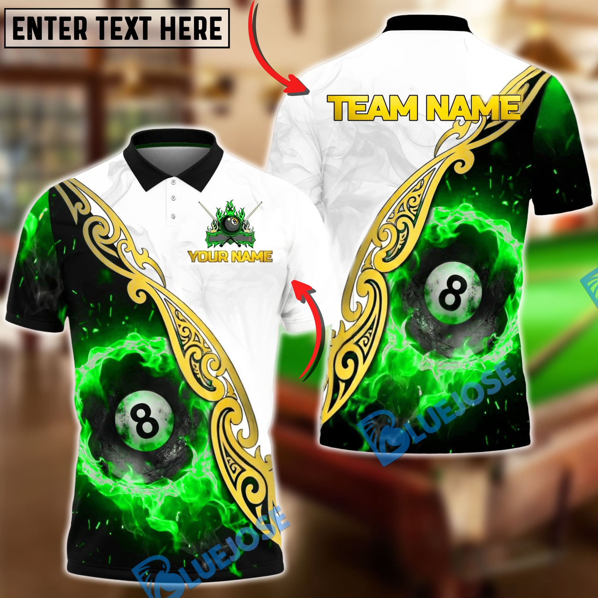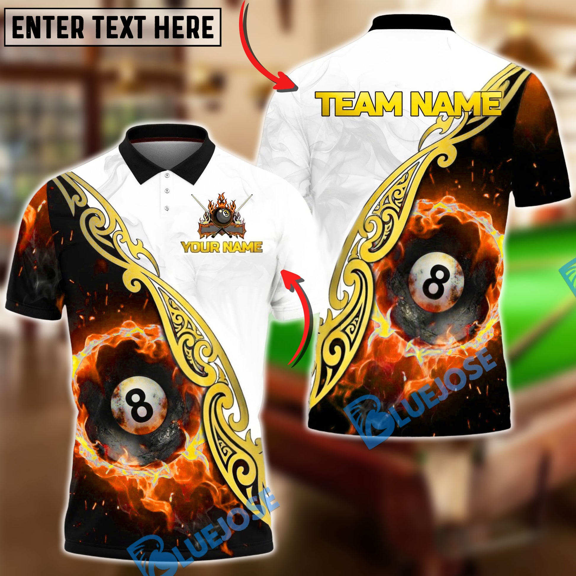 BlueJose Billiards 8 Ball White Gold Fire Personalized Name, Team Name Unisex Shirt (4 Colors)