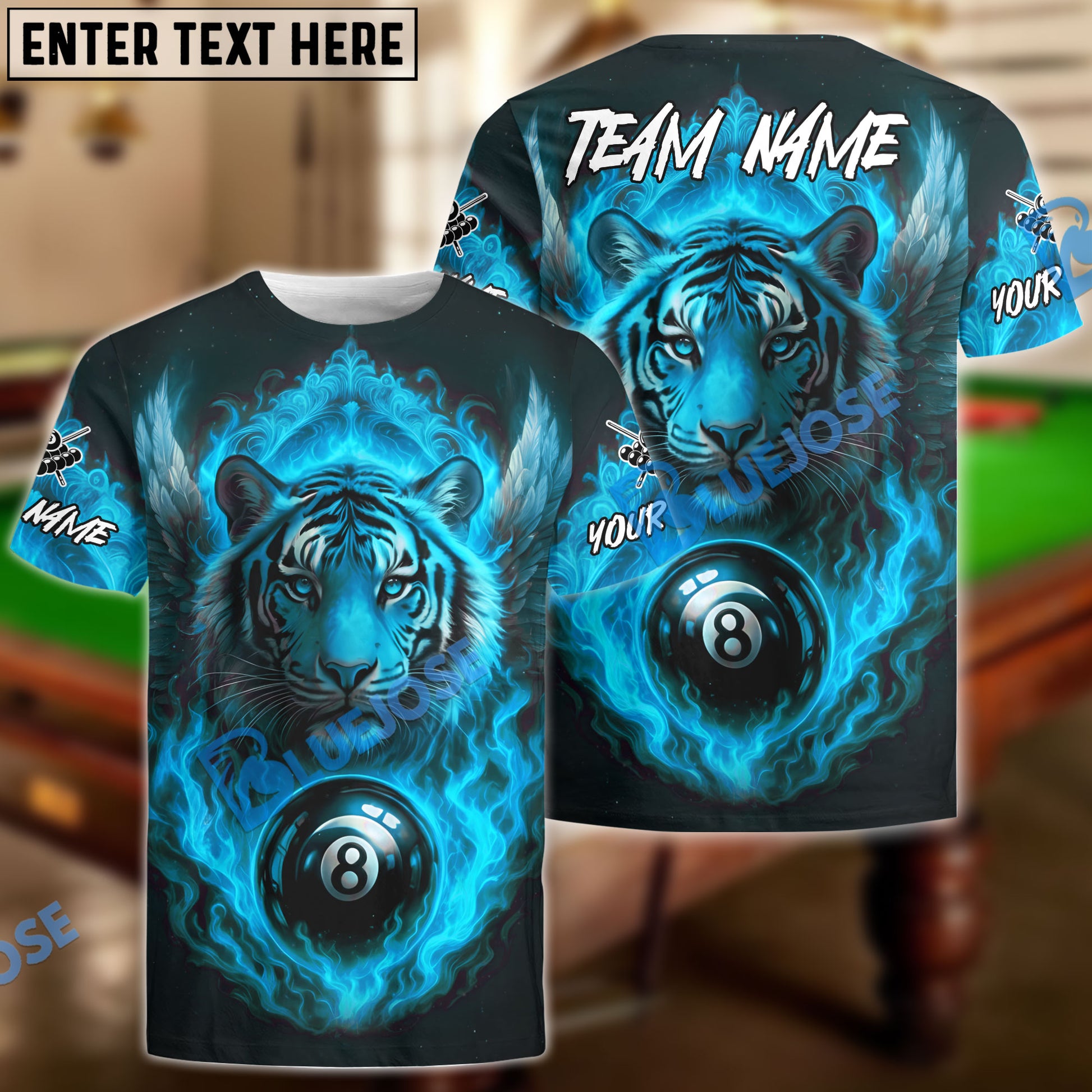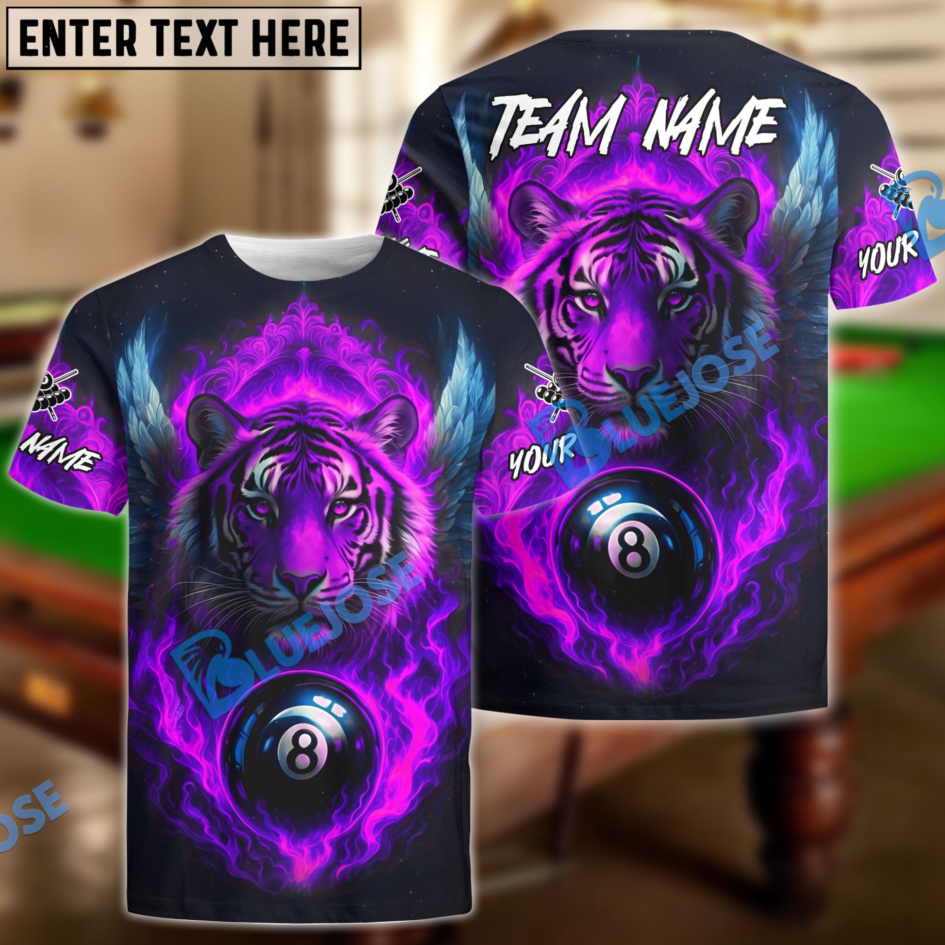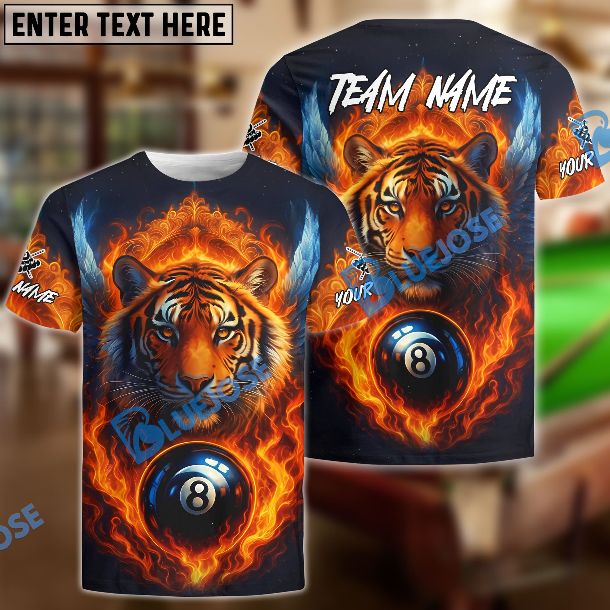 BlueJose Billiards 8 Ball Wings Fiery Tiger Personalized Name, Team Name Unisex Shirt (4 Colors)