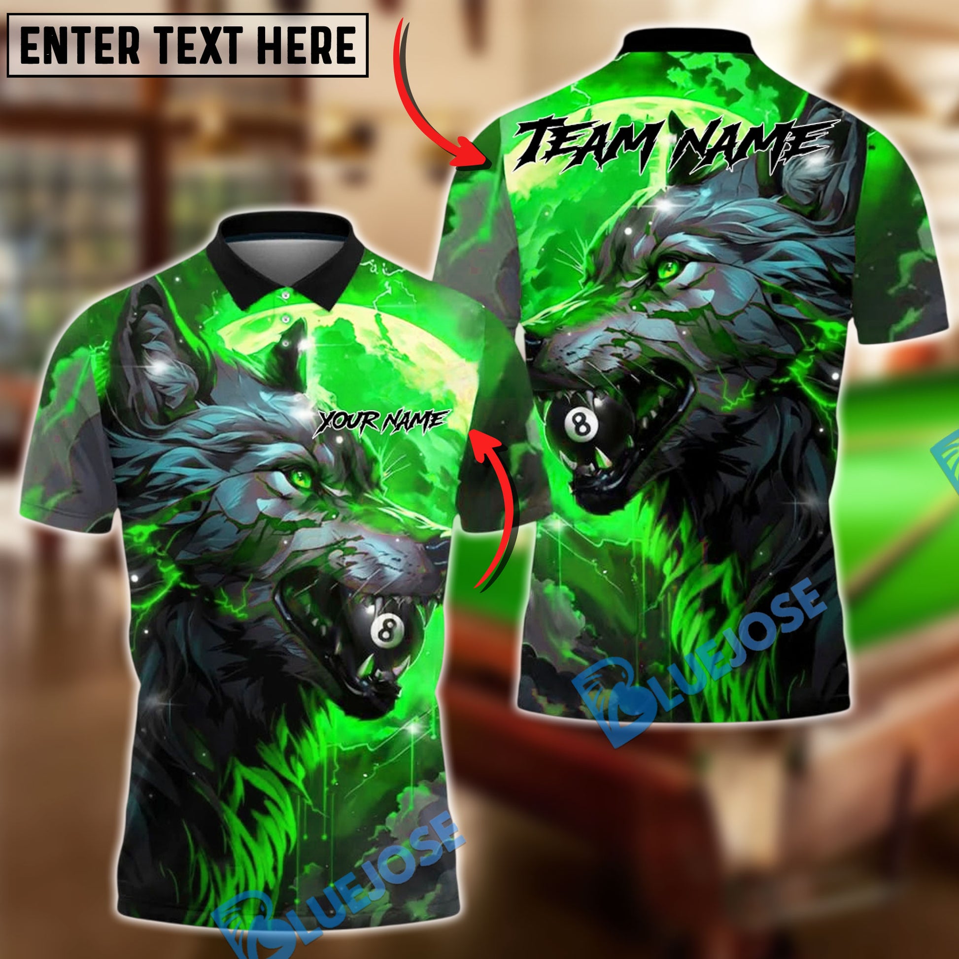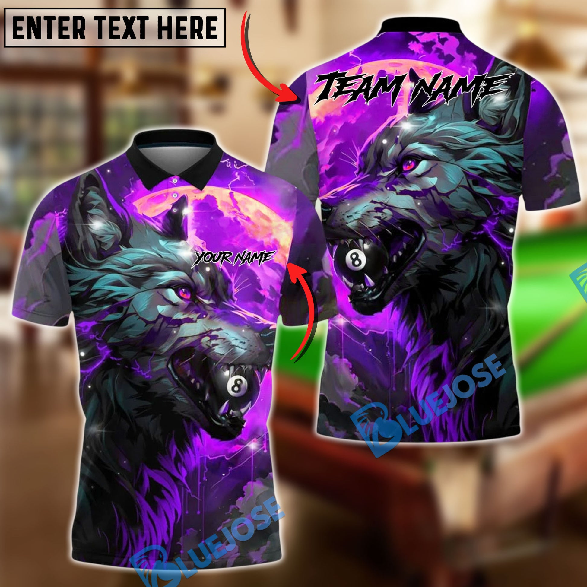 BlueJose Billiards 8 Ball Wolf Flame Fire Theme Personalized Name, Team Name Unisex Shirt (4 Colors)
