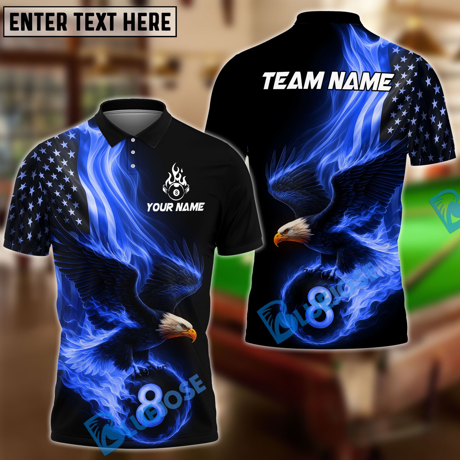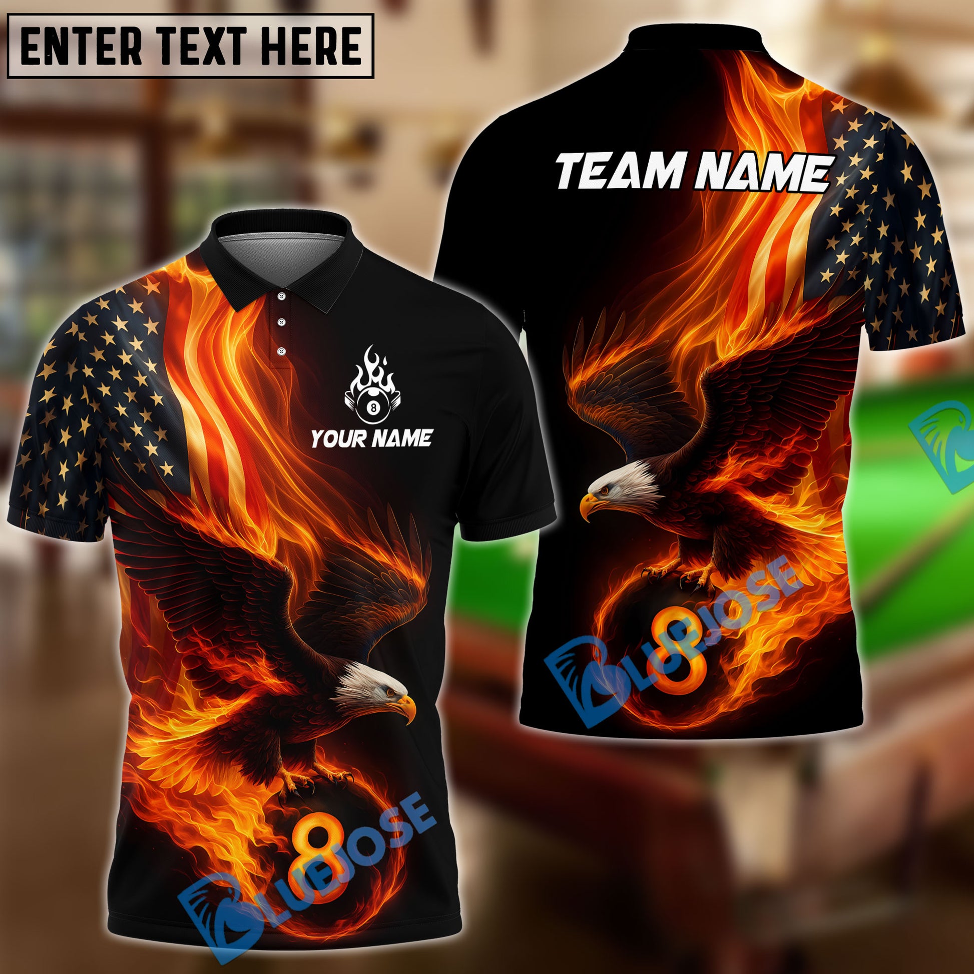 BlueJose Billiards Ball 8 Eagle Flag Flame Personalized Name Shirt (4 Colors)