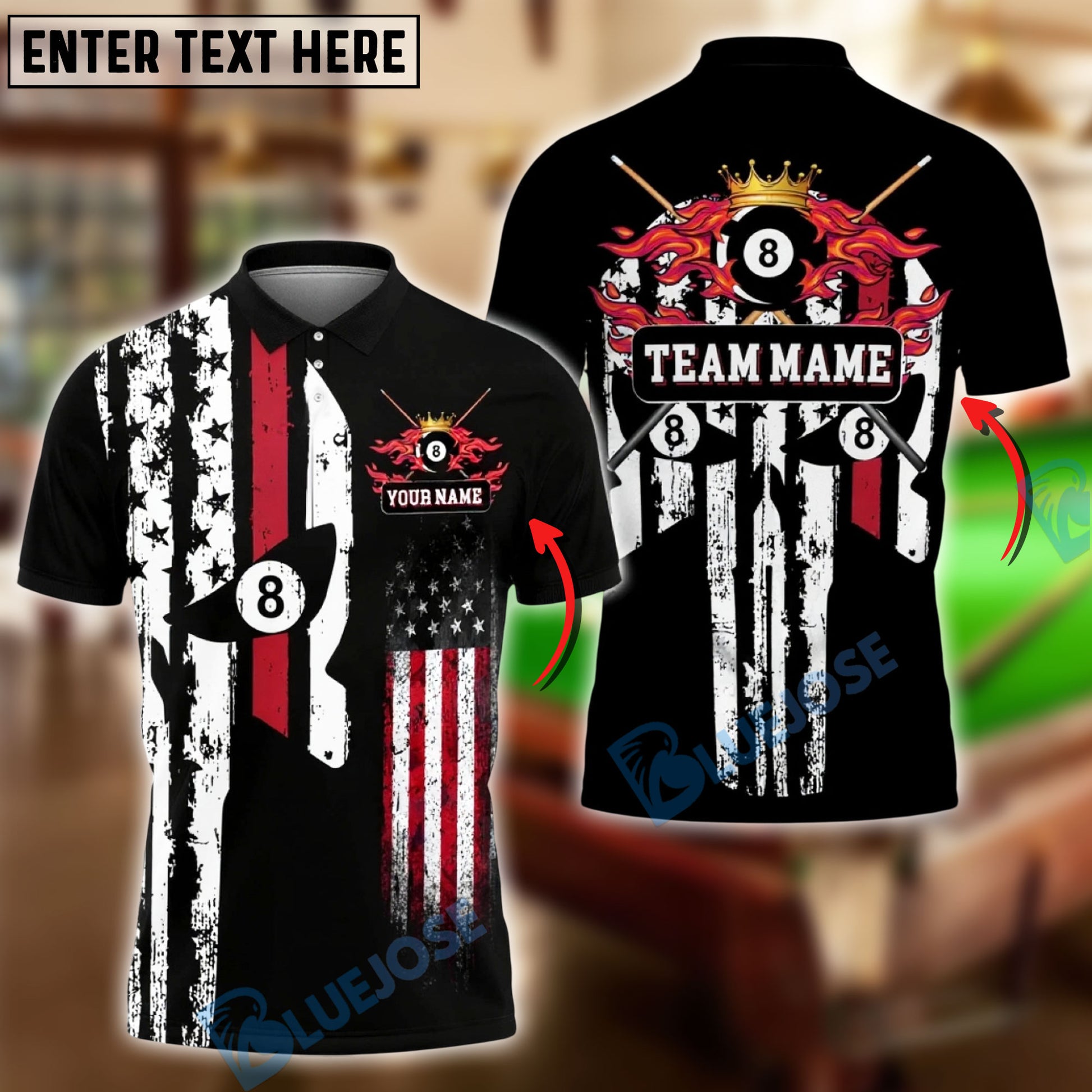 BlueJose Billiards Ball 8 American Flag Punisher Flaming Customized Name, Team Name 3D Shirt