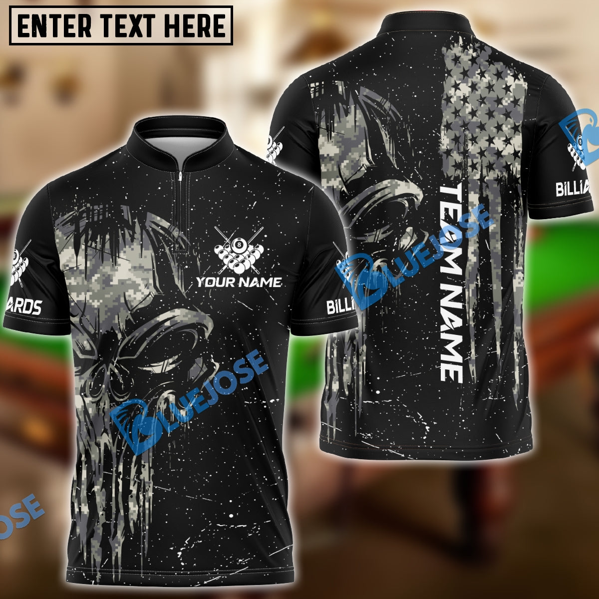 BlueJose Billiards Ball 8 Camo Punisher Skull Personalized Name & Team Name Shirt (4 Colors)