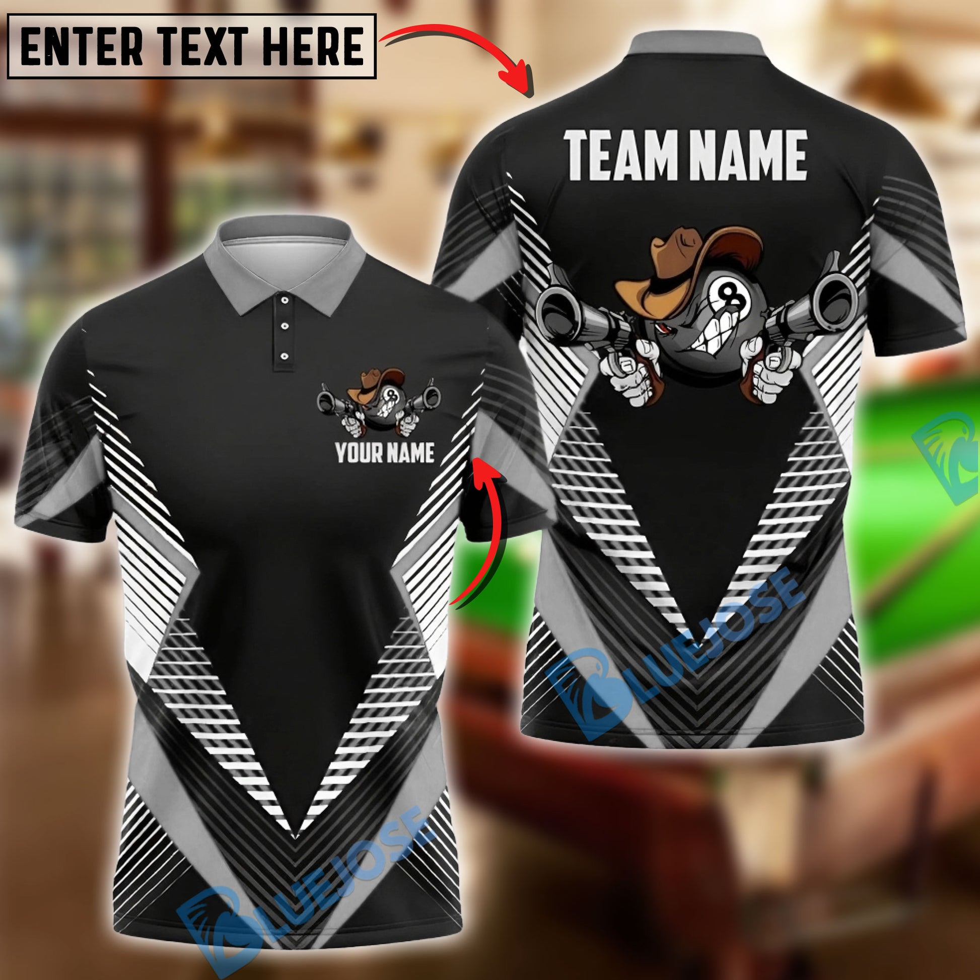 BlueJose Billiards Ball 8 Funny Cowboy Gunslinger Personalized Name, Team Name Unisex Shirt (6 Colors)