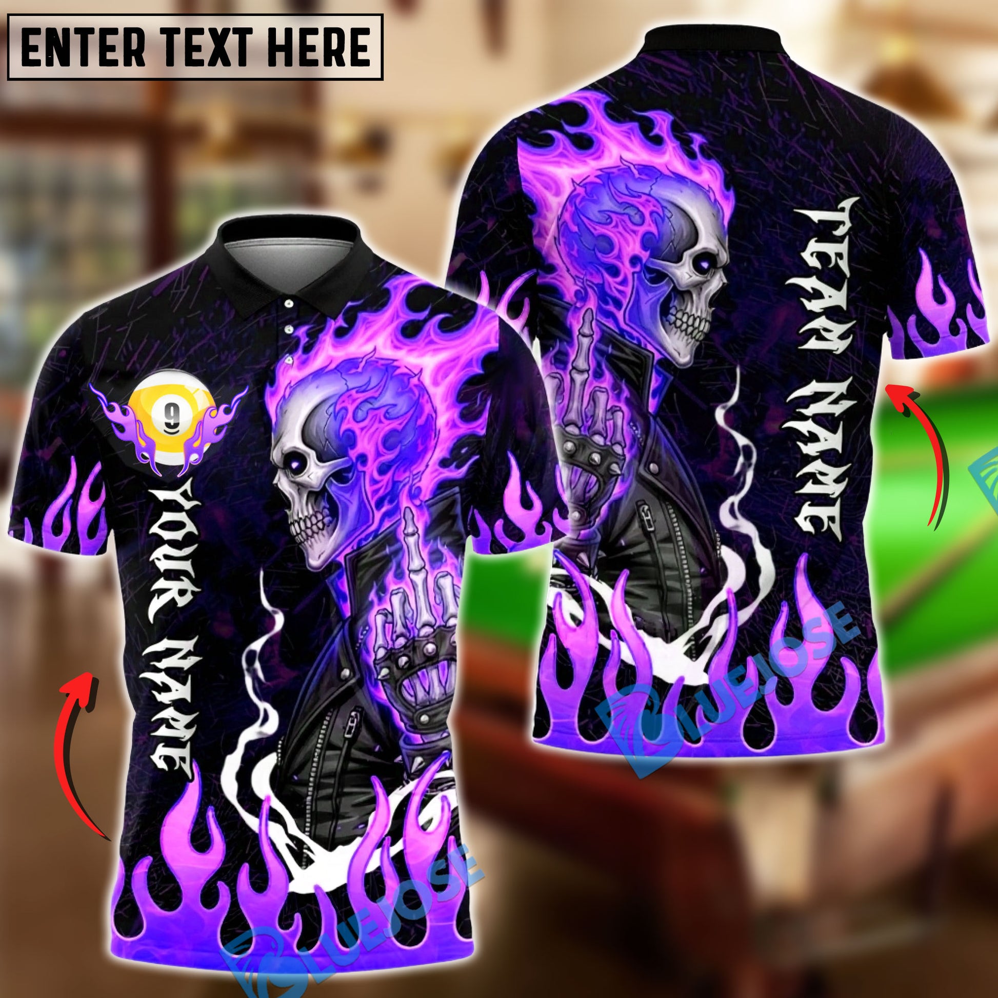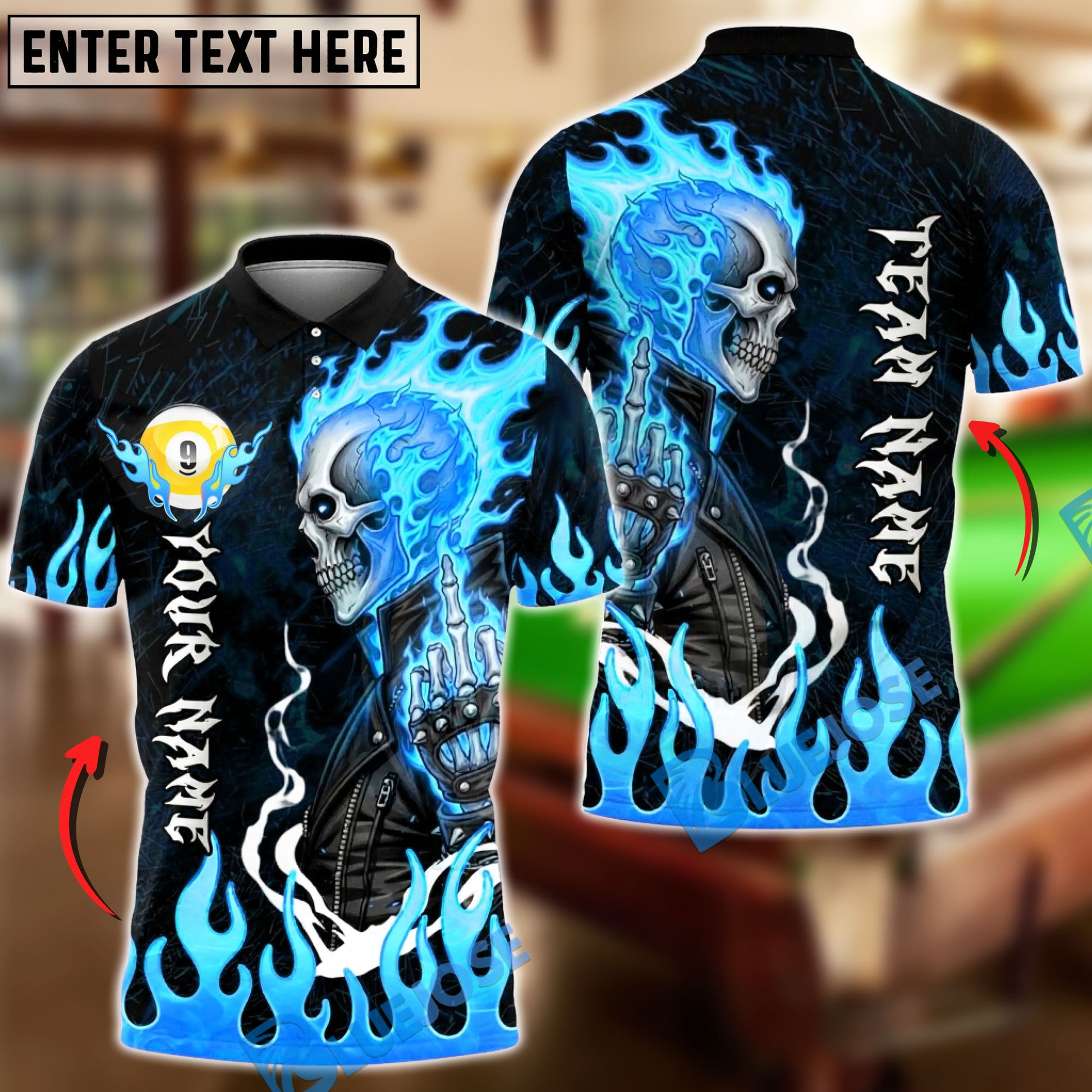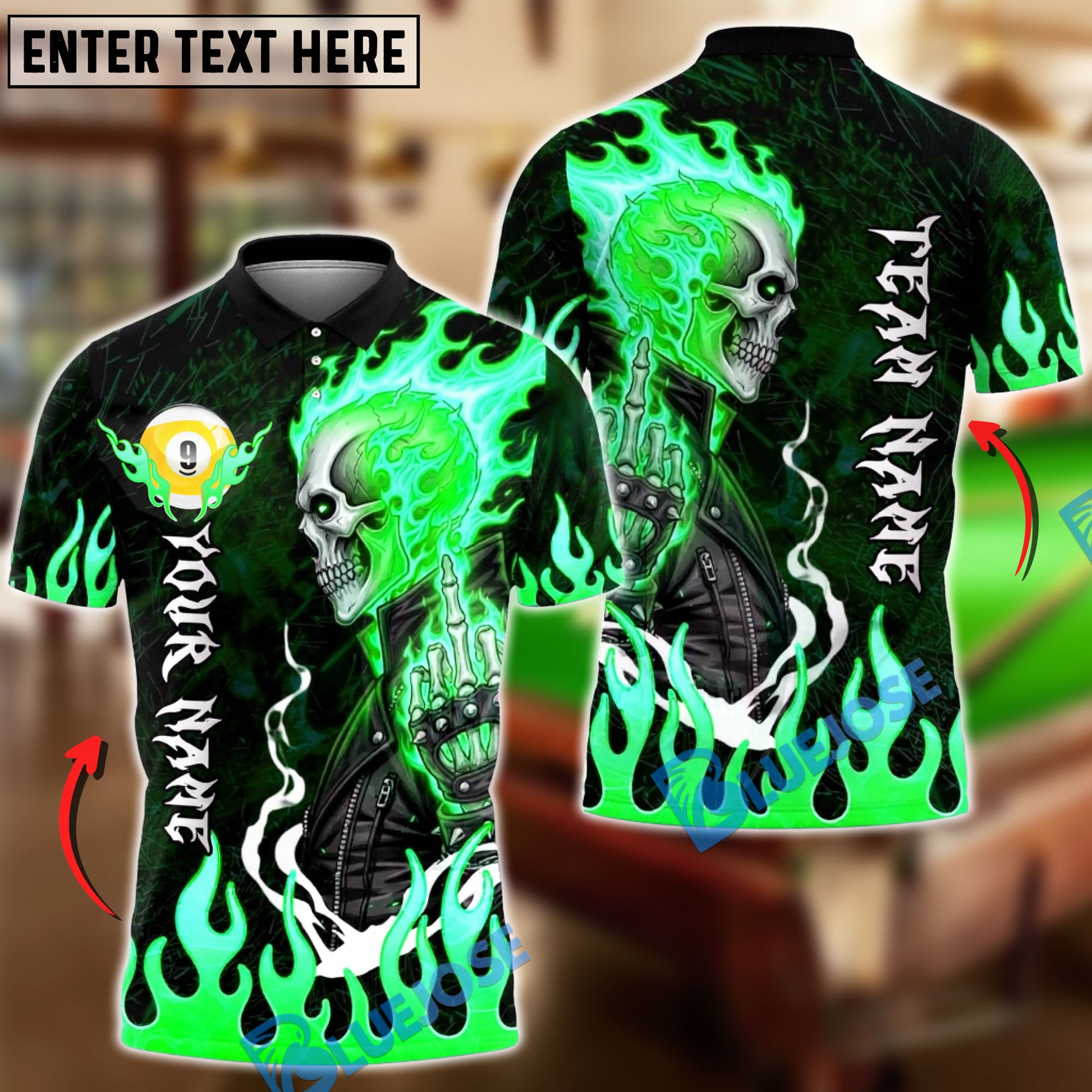 BlueJose Billiards Ball 9 Flaming Biker Skull Middle Finger Customized Name, Team Name 3D Shirt (4 Colors)
