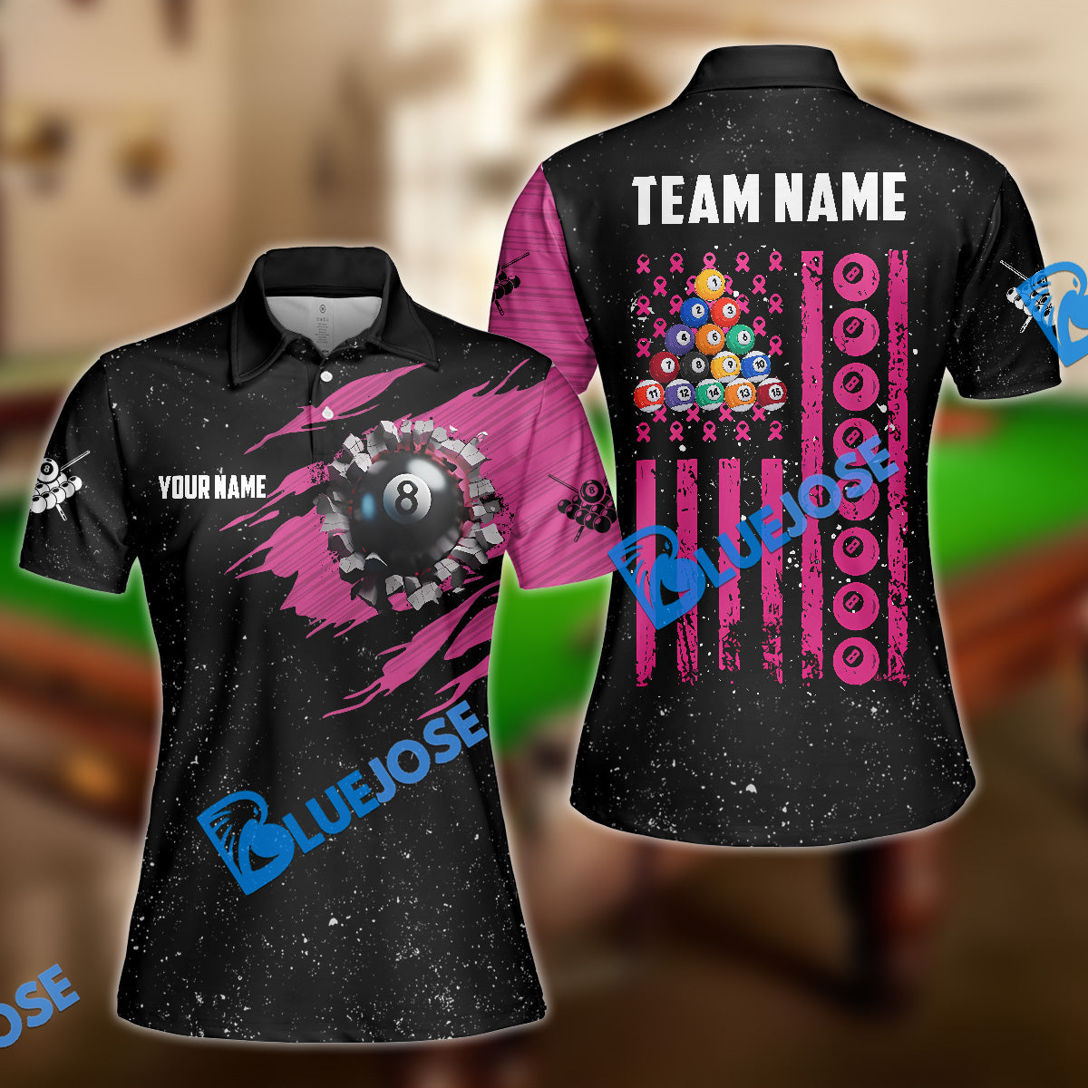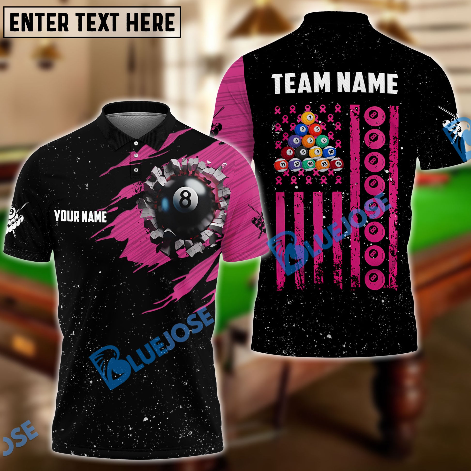 BlueJose Billiards Breast Cancer Awareness Black American Flag Customized Name 3D Shirts