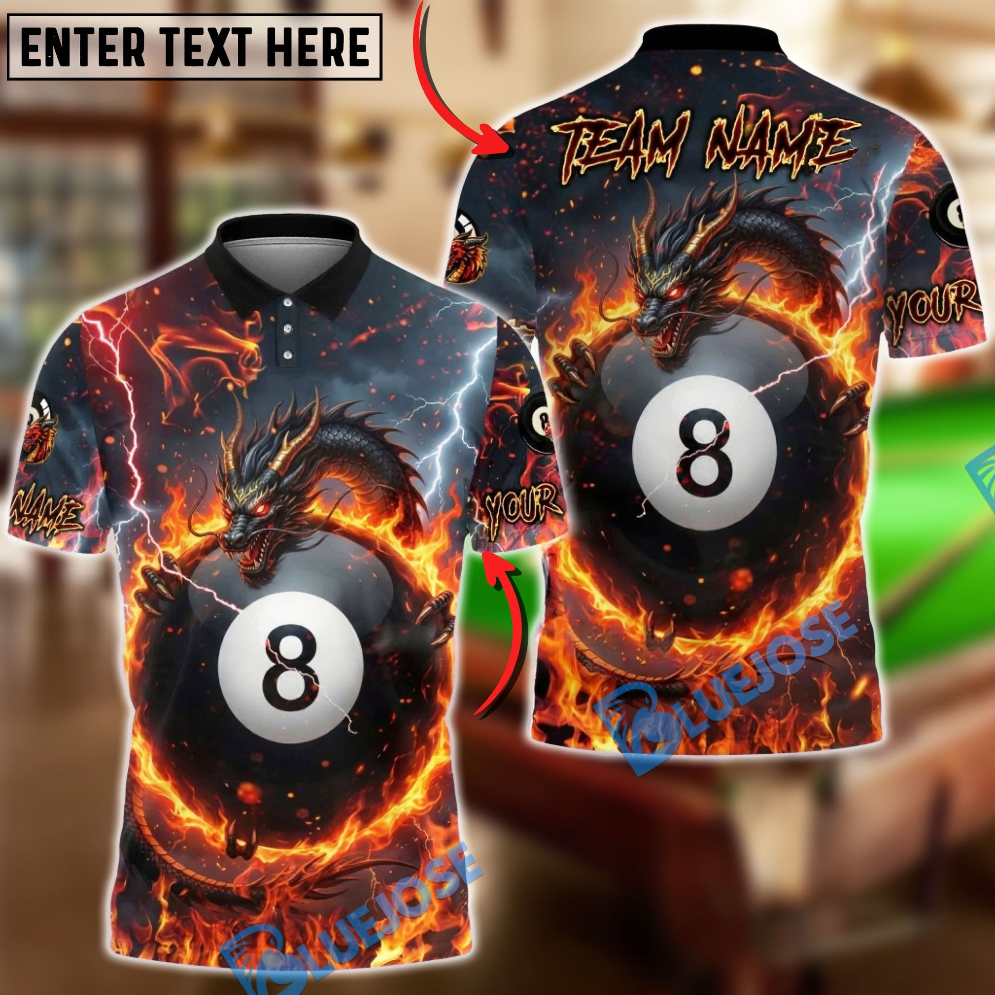 BlueJose Billiards Fire Black Dragon & 8-Ball Customized Name, Team Name 3D Shirt (4 Colors)