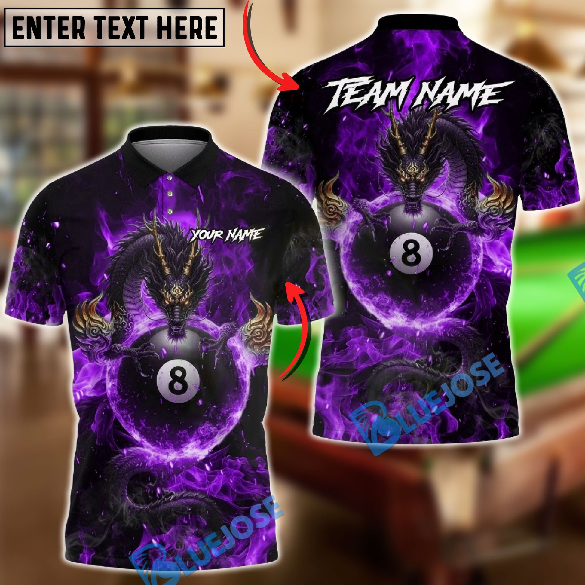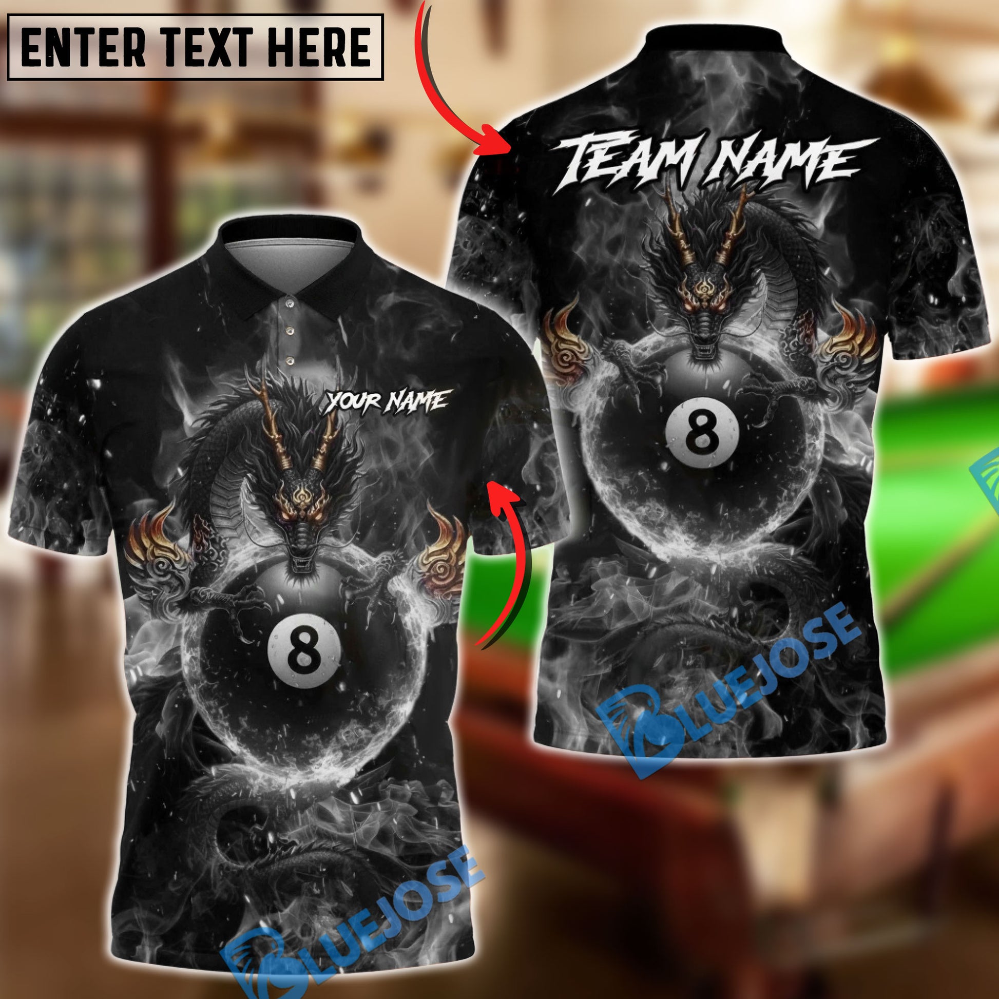 BlueJose Billiards Mystic Dragon Fire Ball 8 Customized Name, Team Name 3D Shirt (6 Colors)