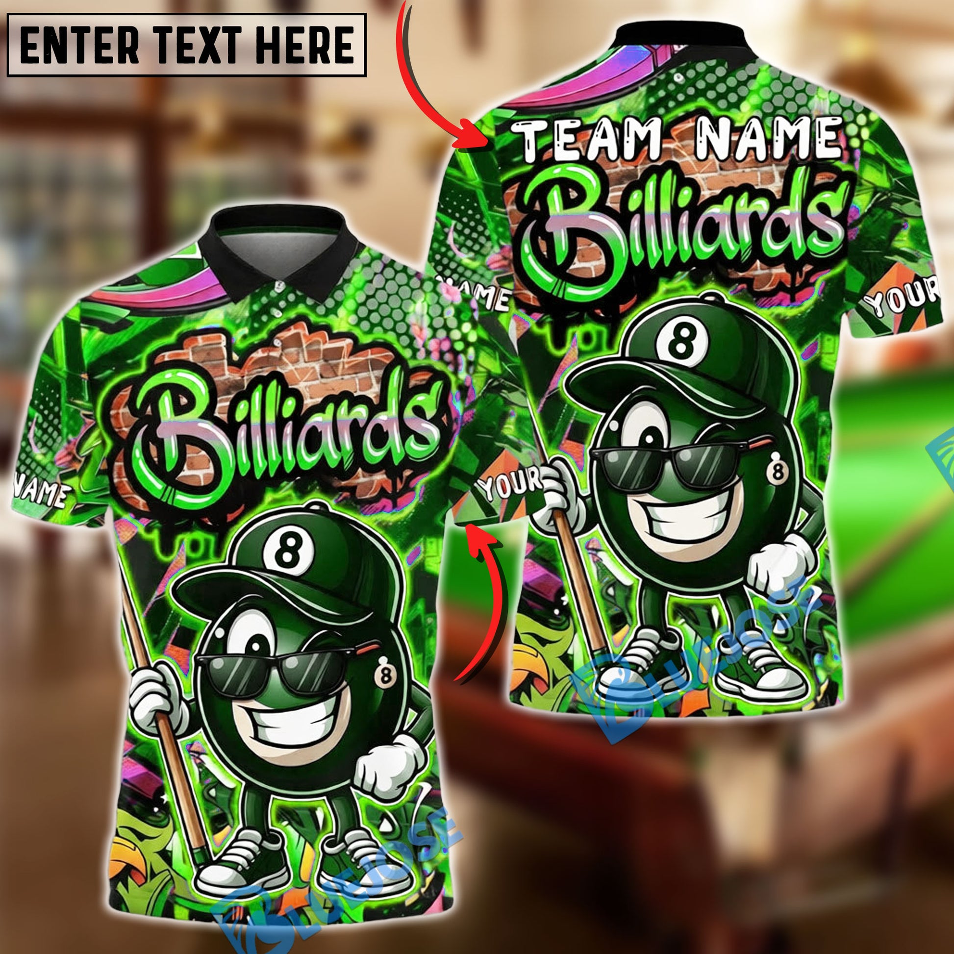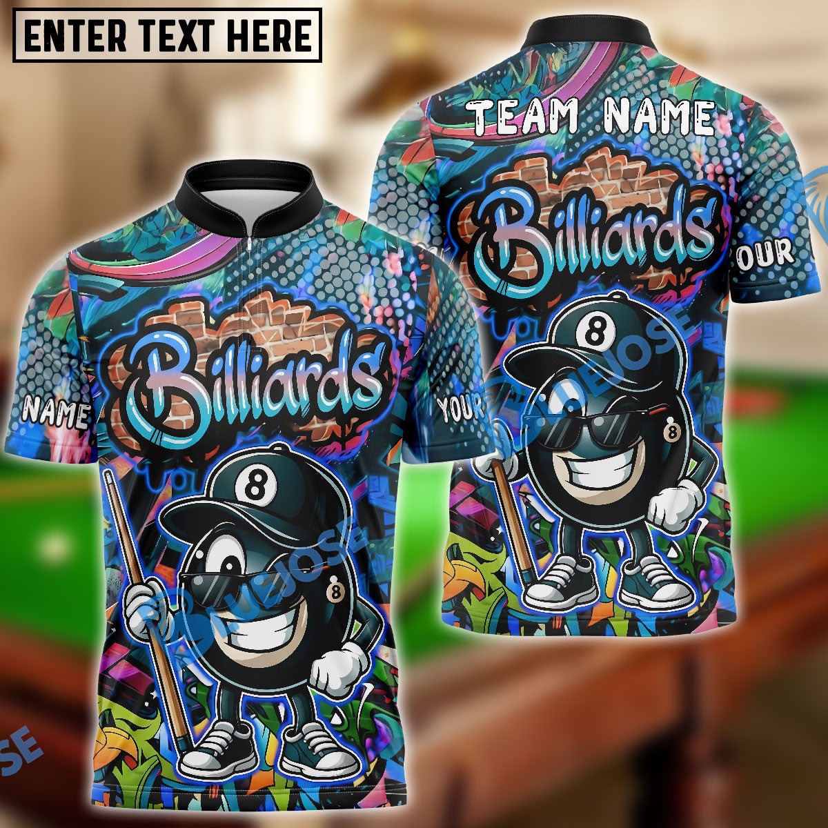 BlueJose Billiards Vibrant Graffiti Style 8-Ball Character Customized Name, Team Name 3D Shirt (4 Colors)