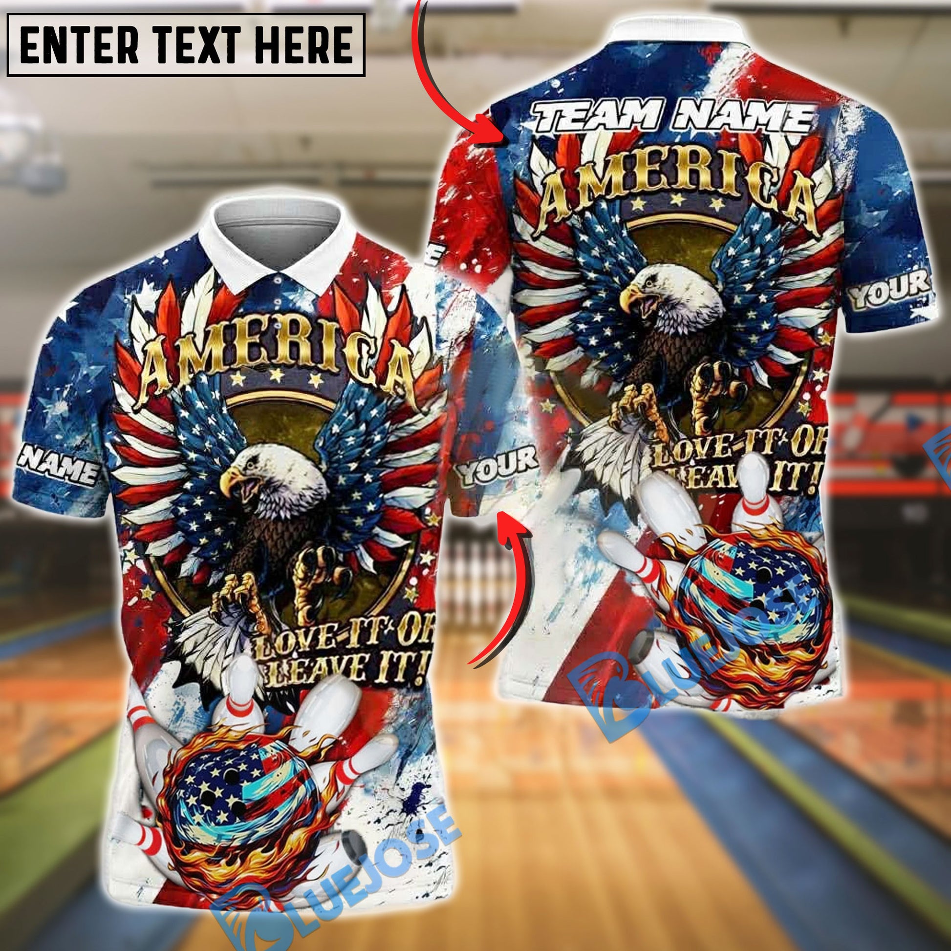 BlueJose Bowling And Pins American Eagle with Flaming USA Flag Bowling Ball Personalized Name, Team Name Shirt