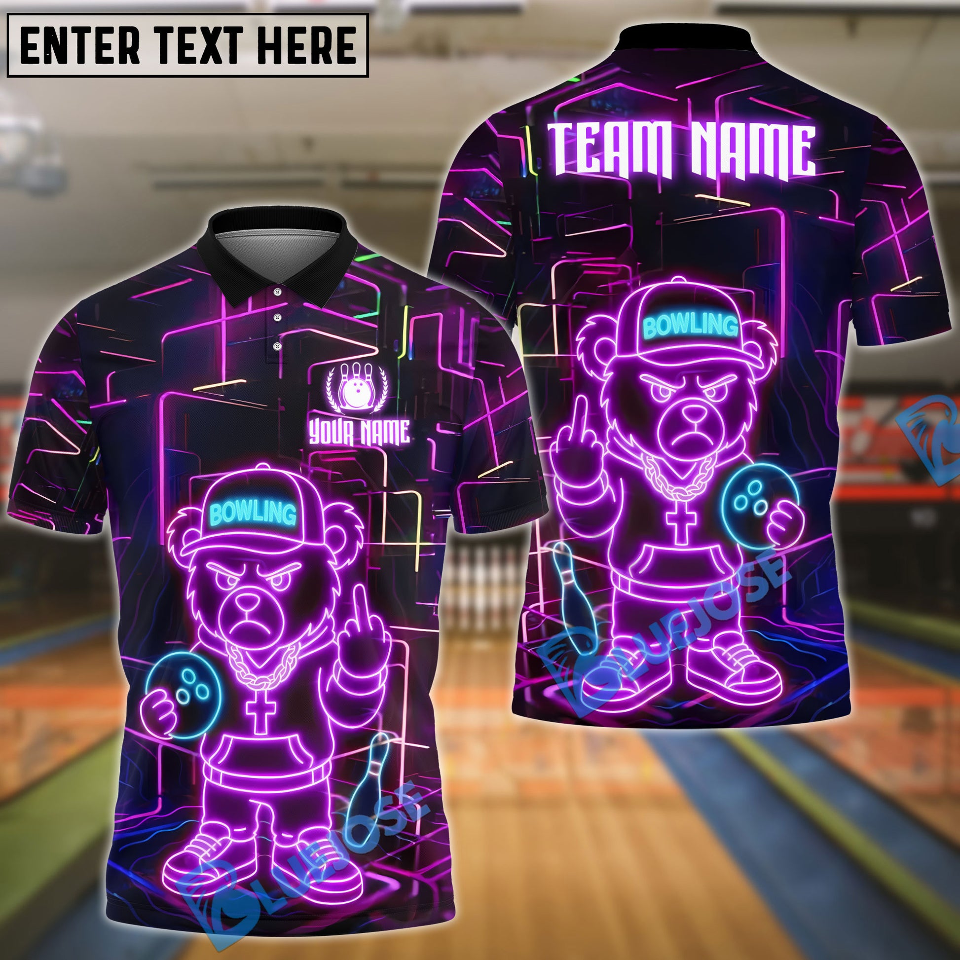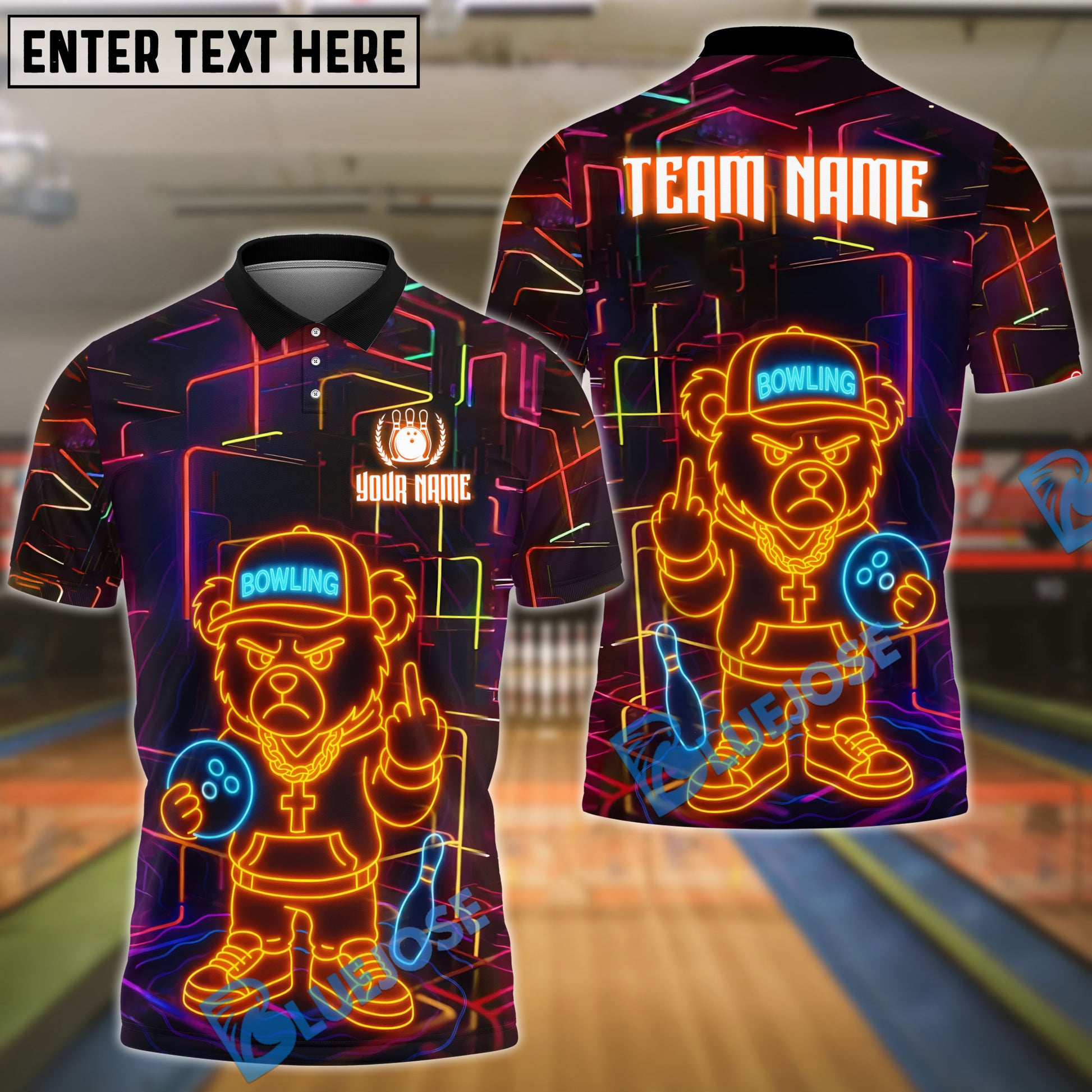 BlueJose Bowling And Pins Bear Crossed Arms Neon Customized Name, Team Name 3D Shirt (4 Colors)