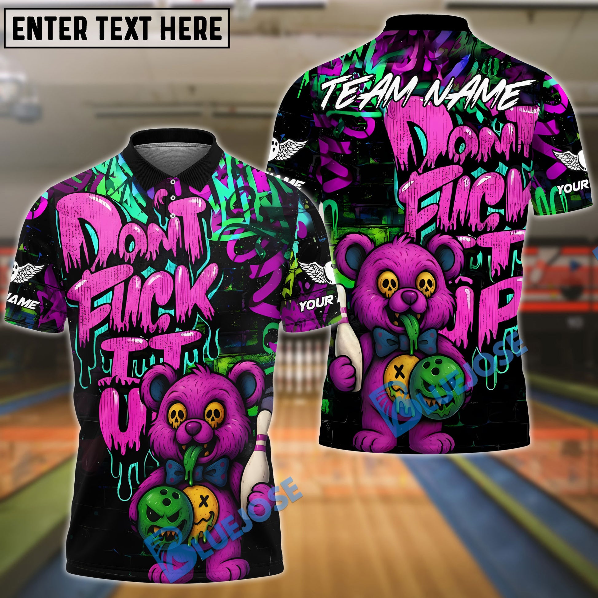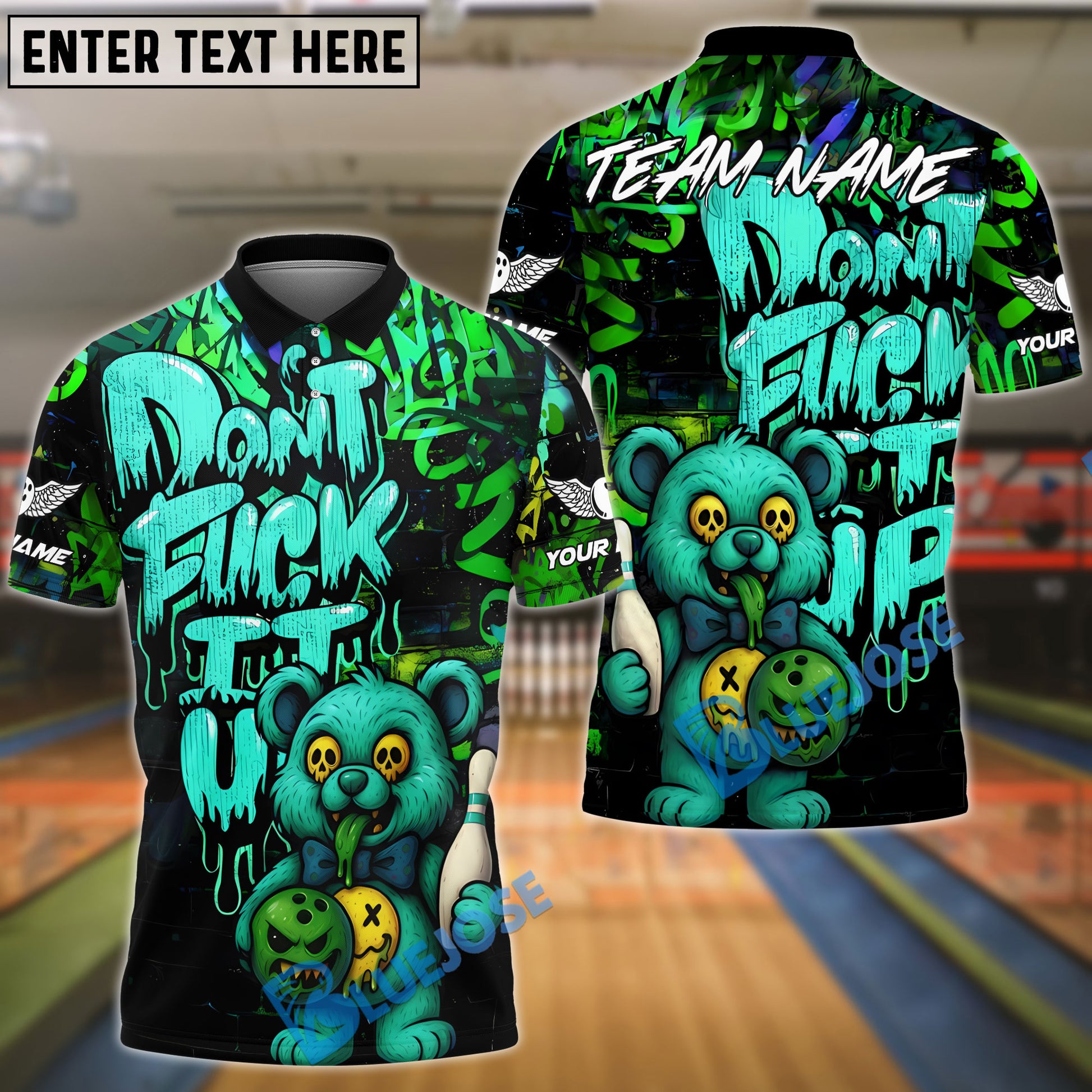 BlueJose Bowling And Pins Bear Scary Teddy Graffiti Style Customized Name, Team Name 3D Shirt (4 Colors)