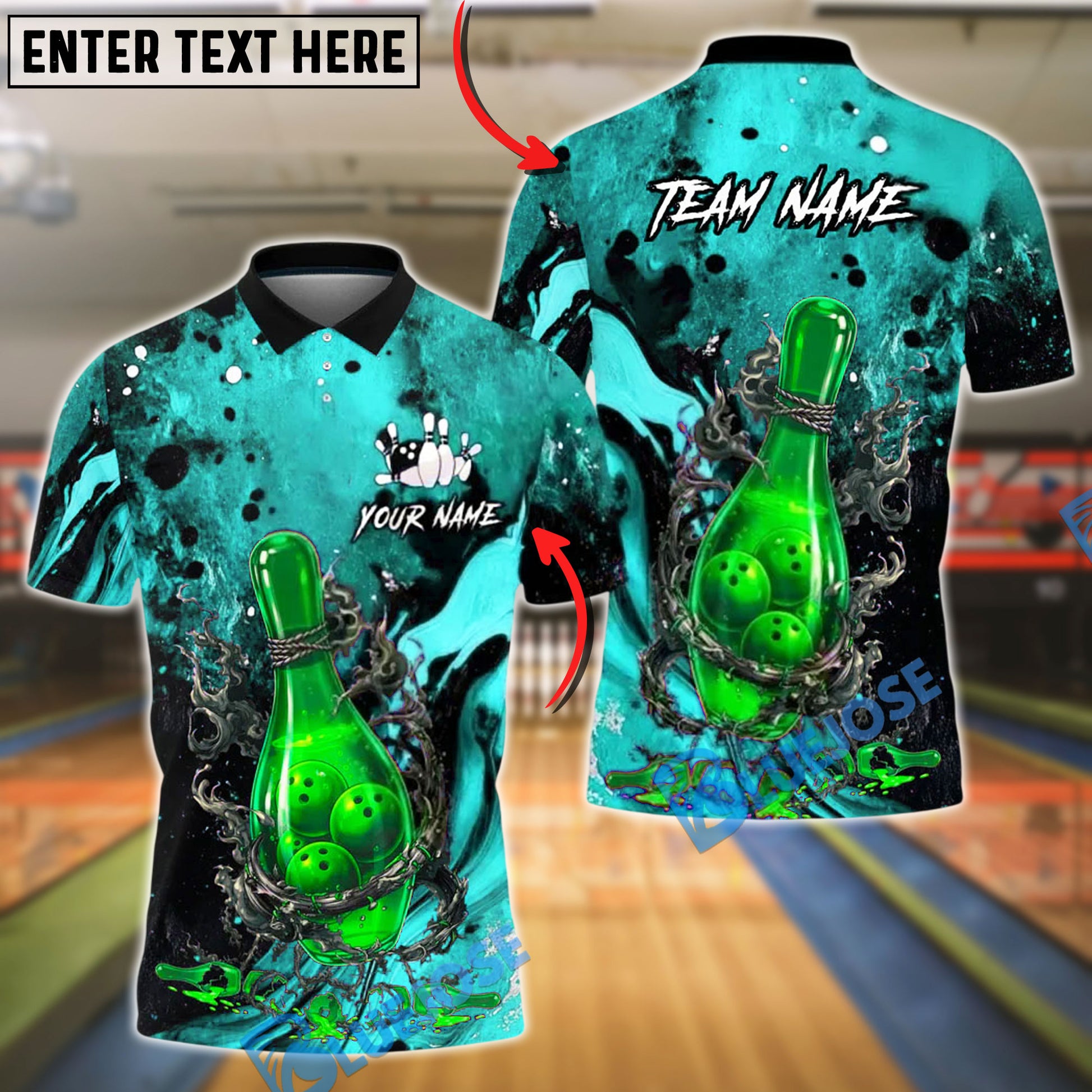 BlueJose Bowling And Pins Bottle Flame Graphic Customized Name, Team Name 3D Shirt (4 Colors)