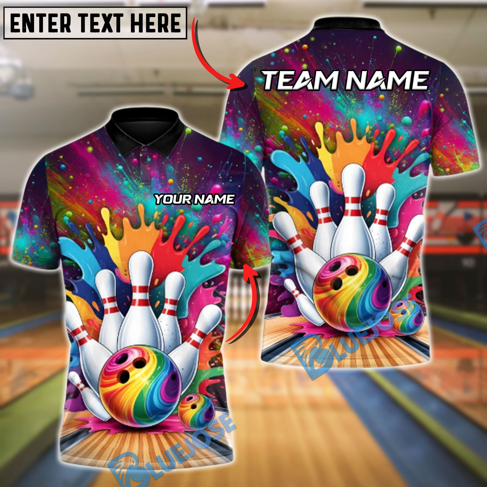 BlueJose Bowling And Pins Color Splash Personalized Name, Team Name Shirt