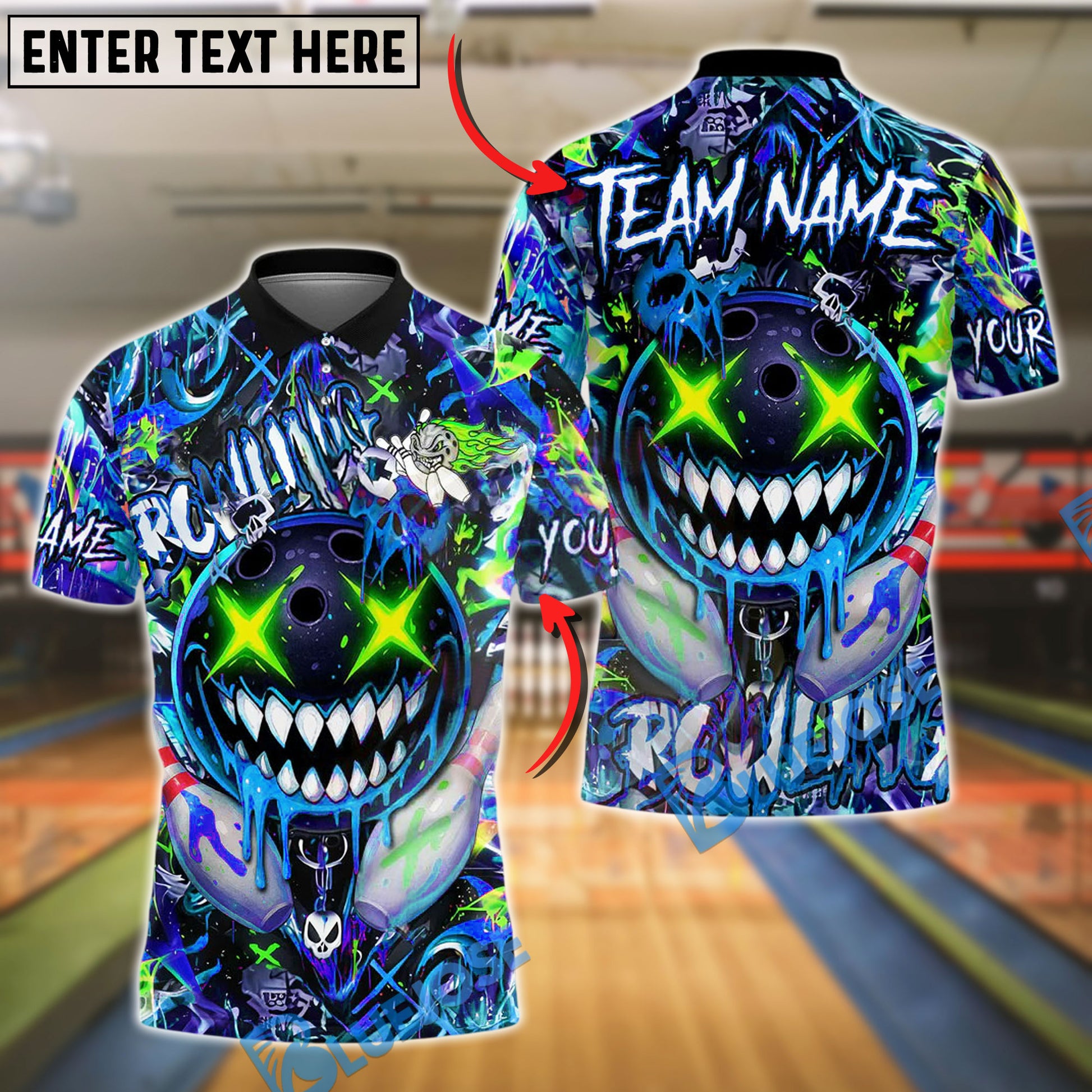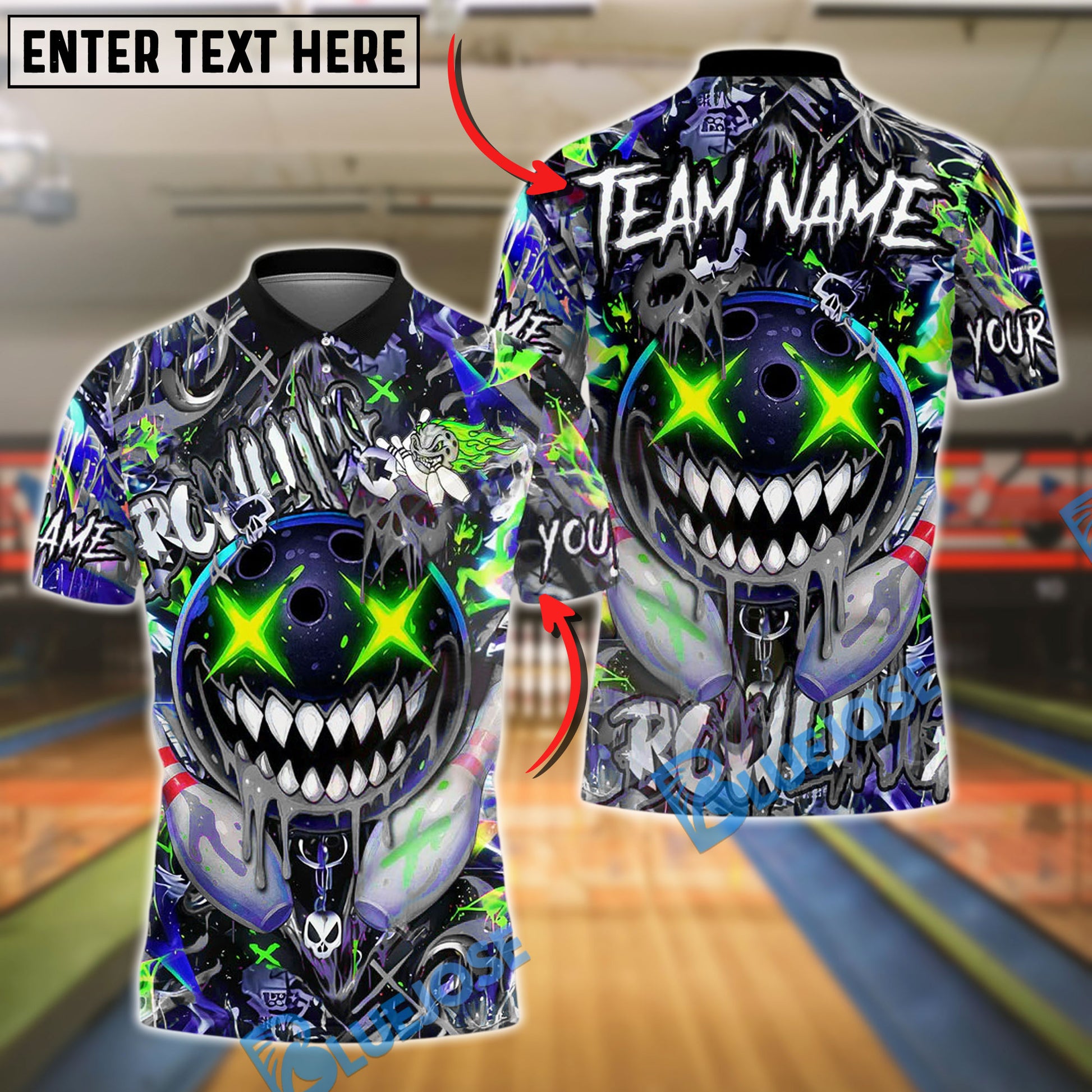 BlueJose Bowling And Pins Crazy Smile Neon Graffiti Customized Name, Team Name 3D Shirt (4 Colors)