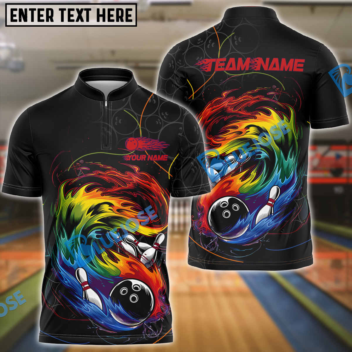 BlueJose Bowling And Pins Curved Paint Customized Name, Team Name 3D Shirt (4 Colors)