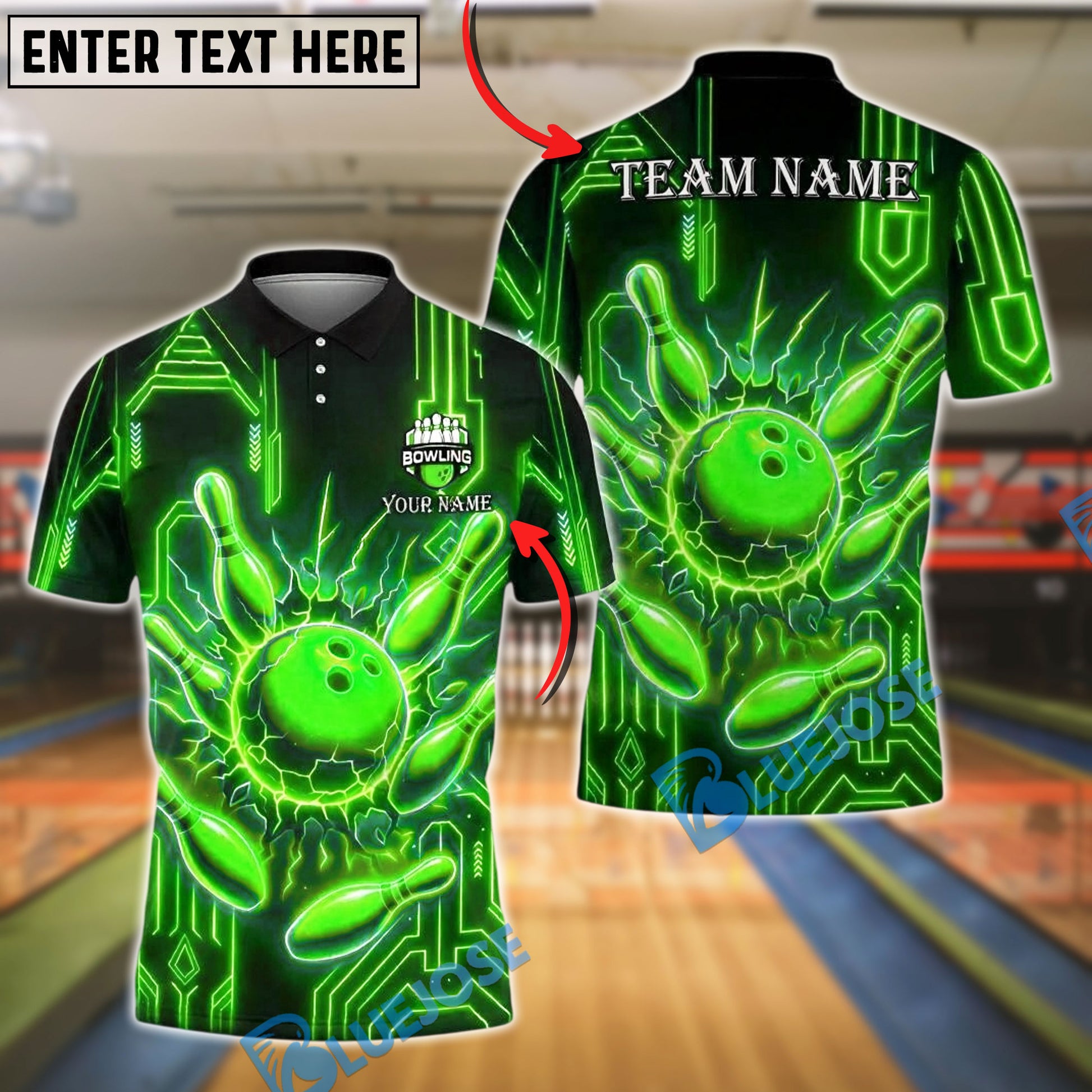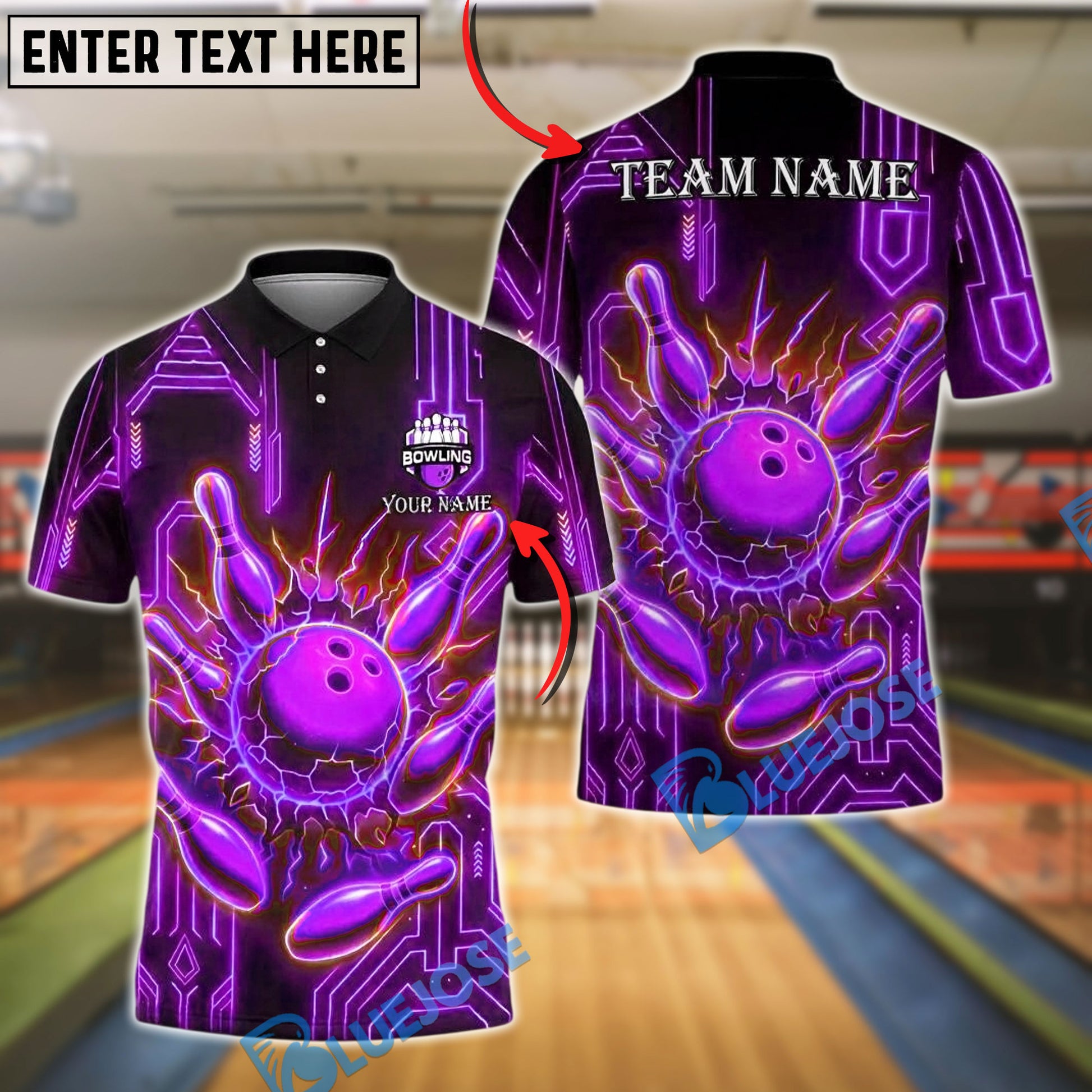 BlueJose Bowling And Pins Electric Strike Red Ball Customized Name, Team Name 3D Shirt (4 Colors)