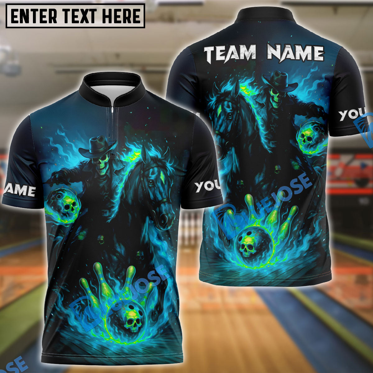 BlueJose Bowling And Pins Fiery Cowboy Skeleton Ghost Rider Style Customized Name 3D Shirt (4 Colors)