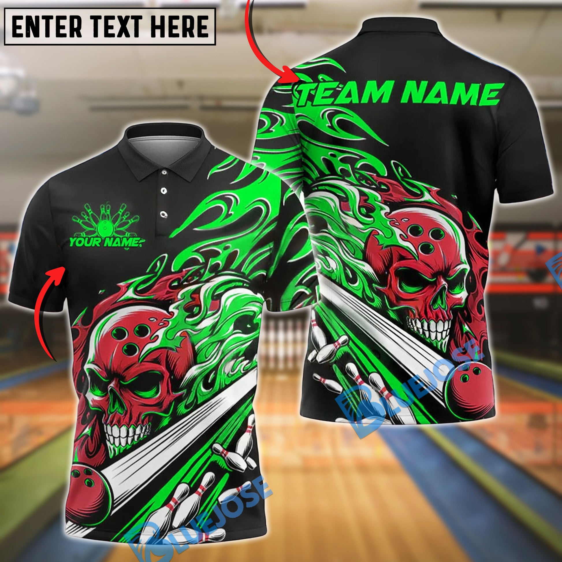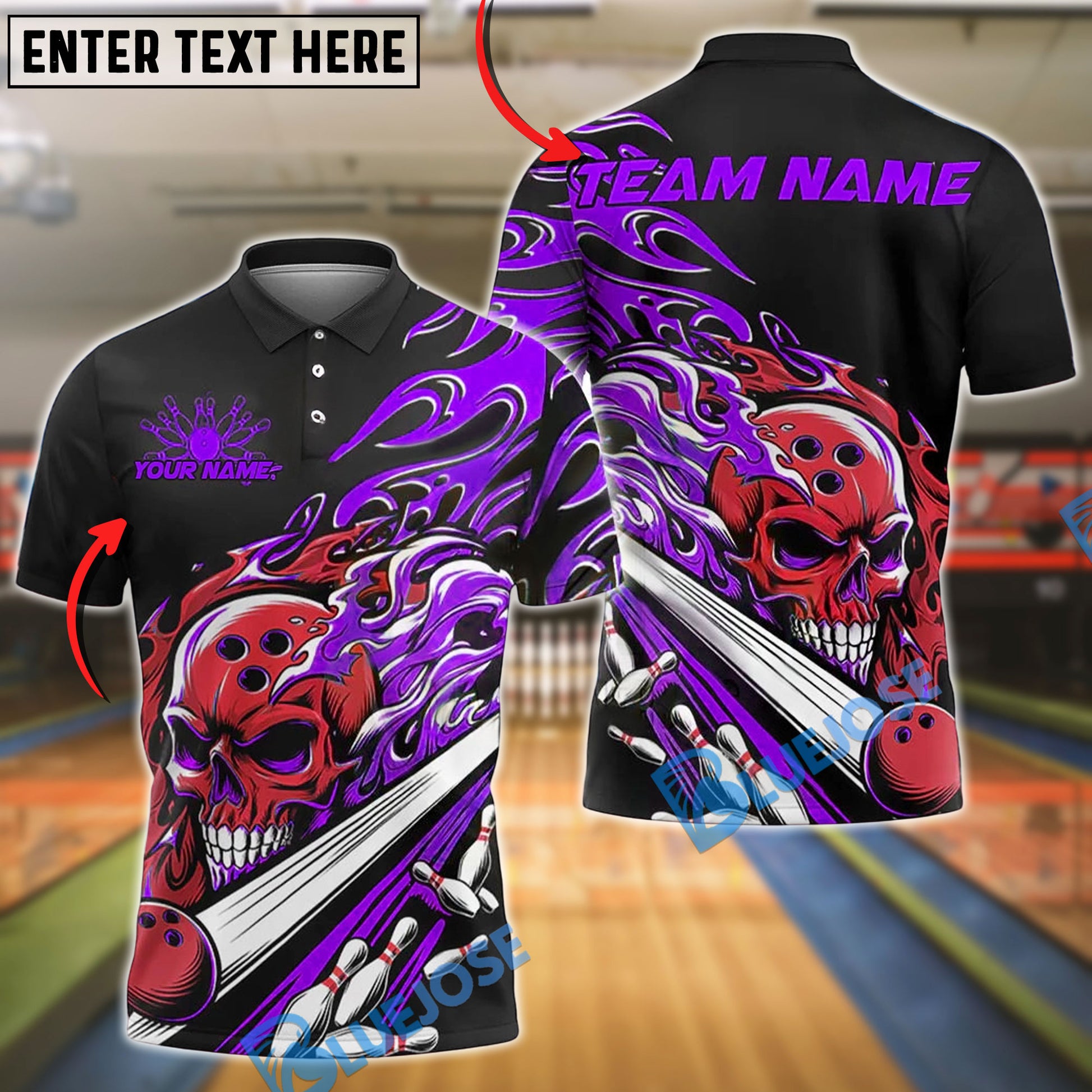 BlueJose Bowling And Pins Fiery Skull Lane Strike Customized Name, Team Name 3D Shirt (4 Colors)