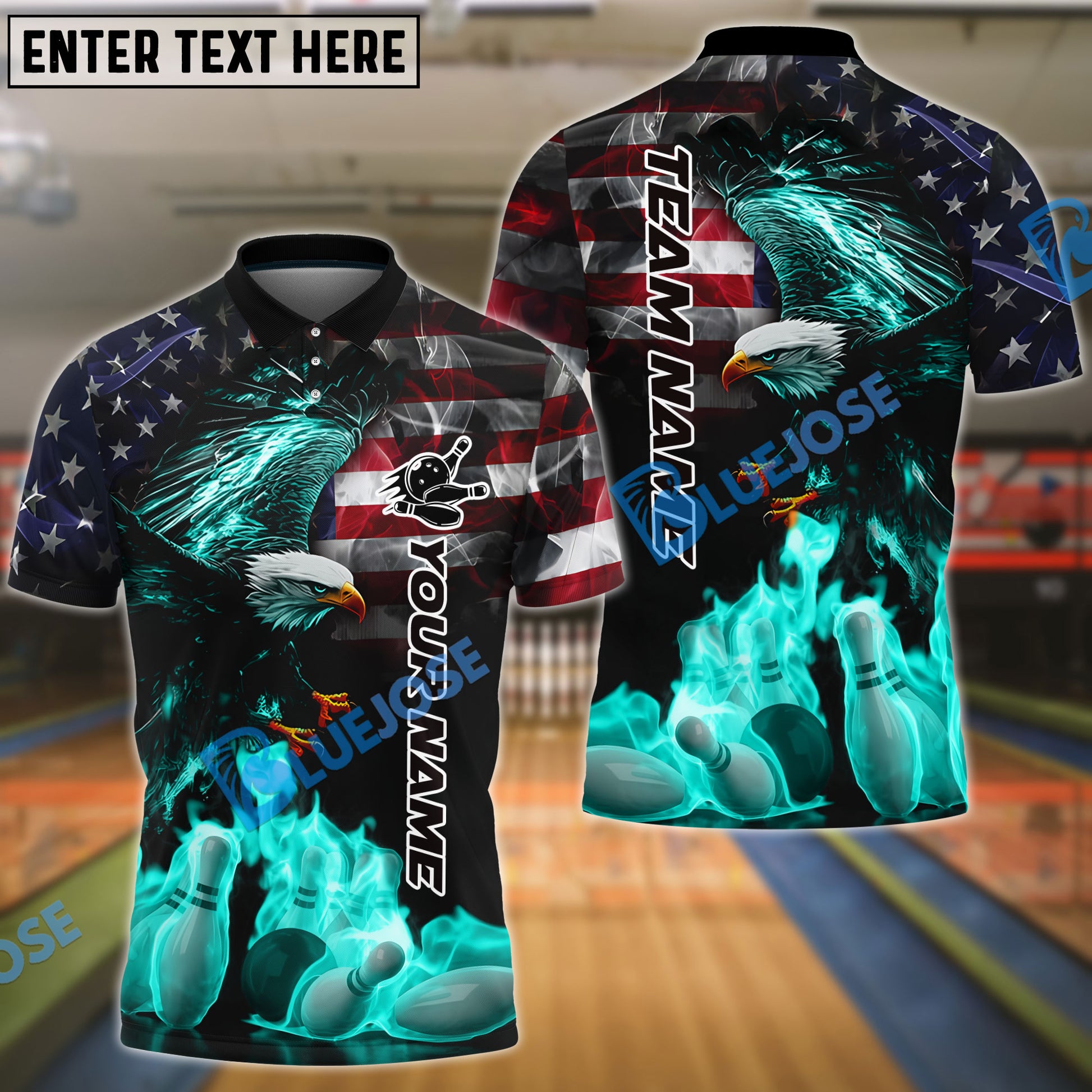 BlueJose Bowling And Pins Flame American Eagle Customized Name, Team Name 3D Shirt (4 Colors)