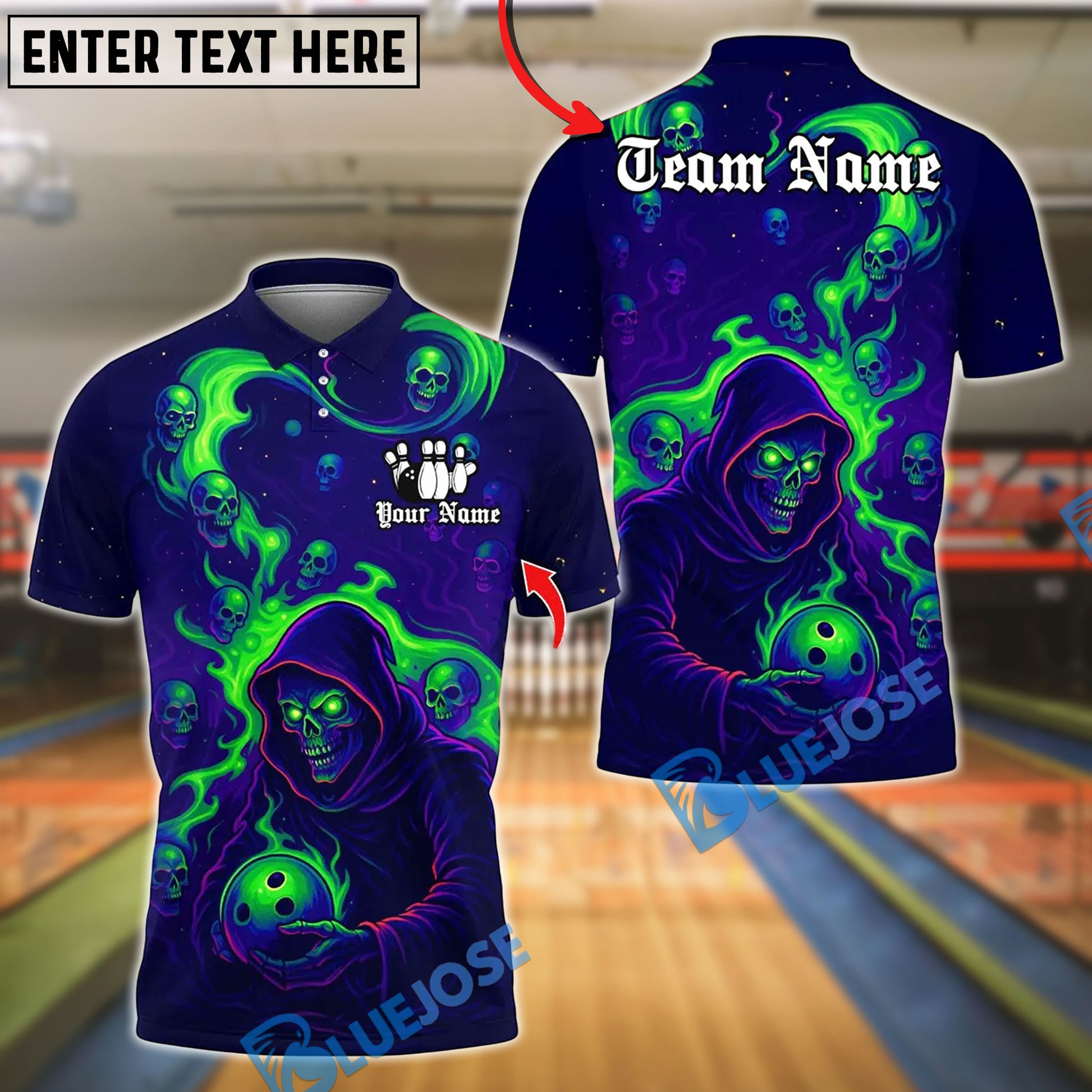BlueJose Bowling And Pins Flame Grim Reaper With Bowling Design Customized Name, Team Name 3D Shirt (4 Colors)