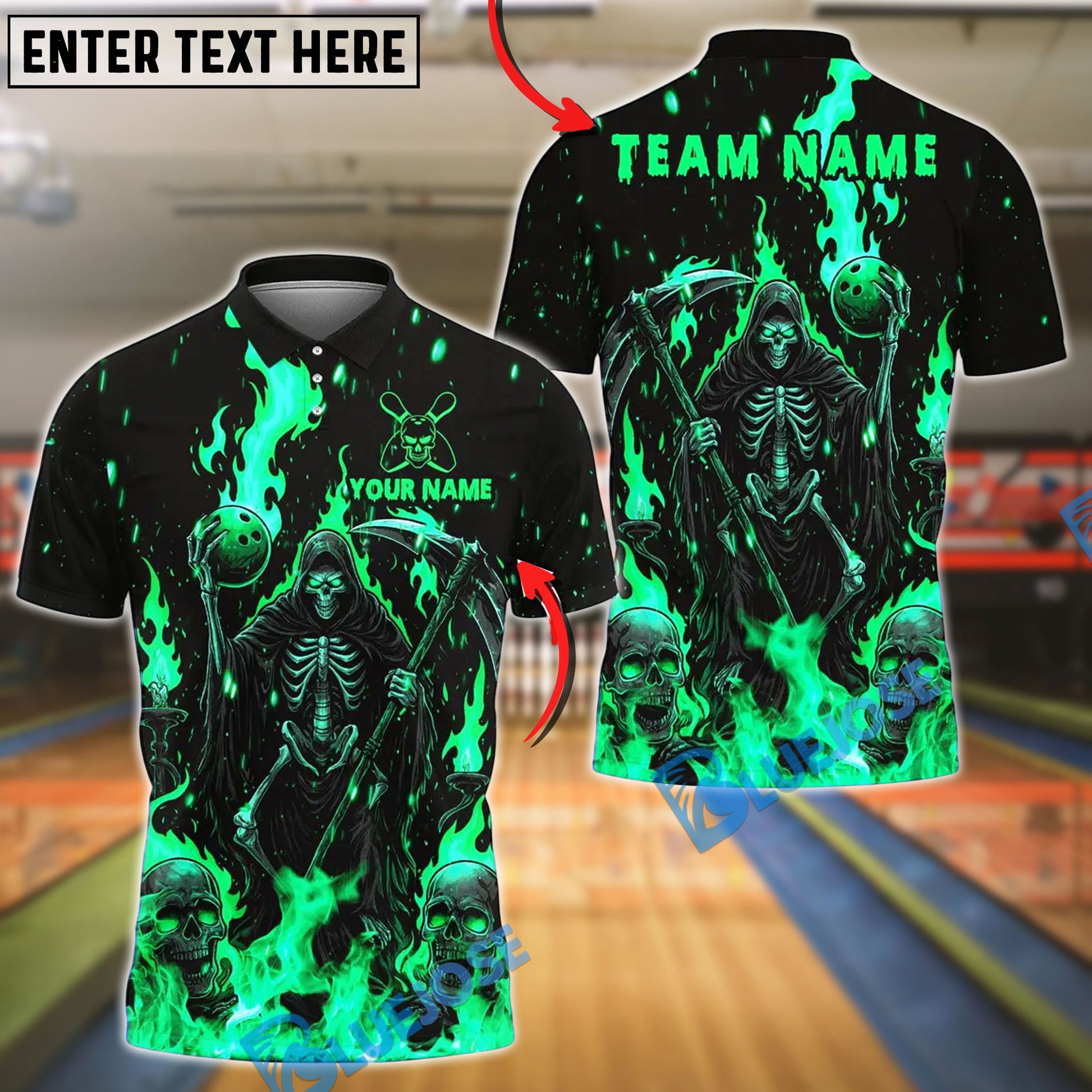 BlueJose Bowling And Pins Flame Reaper And Fire Skull Design Customized Name, Team Name 3D Shirt (4 Colors)