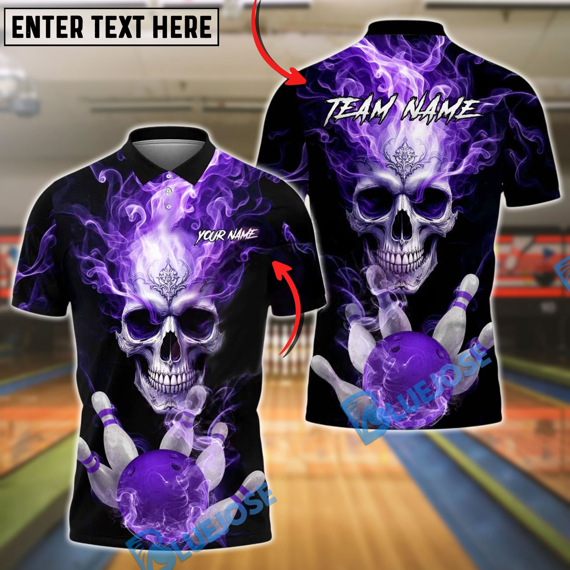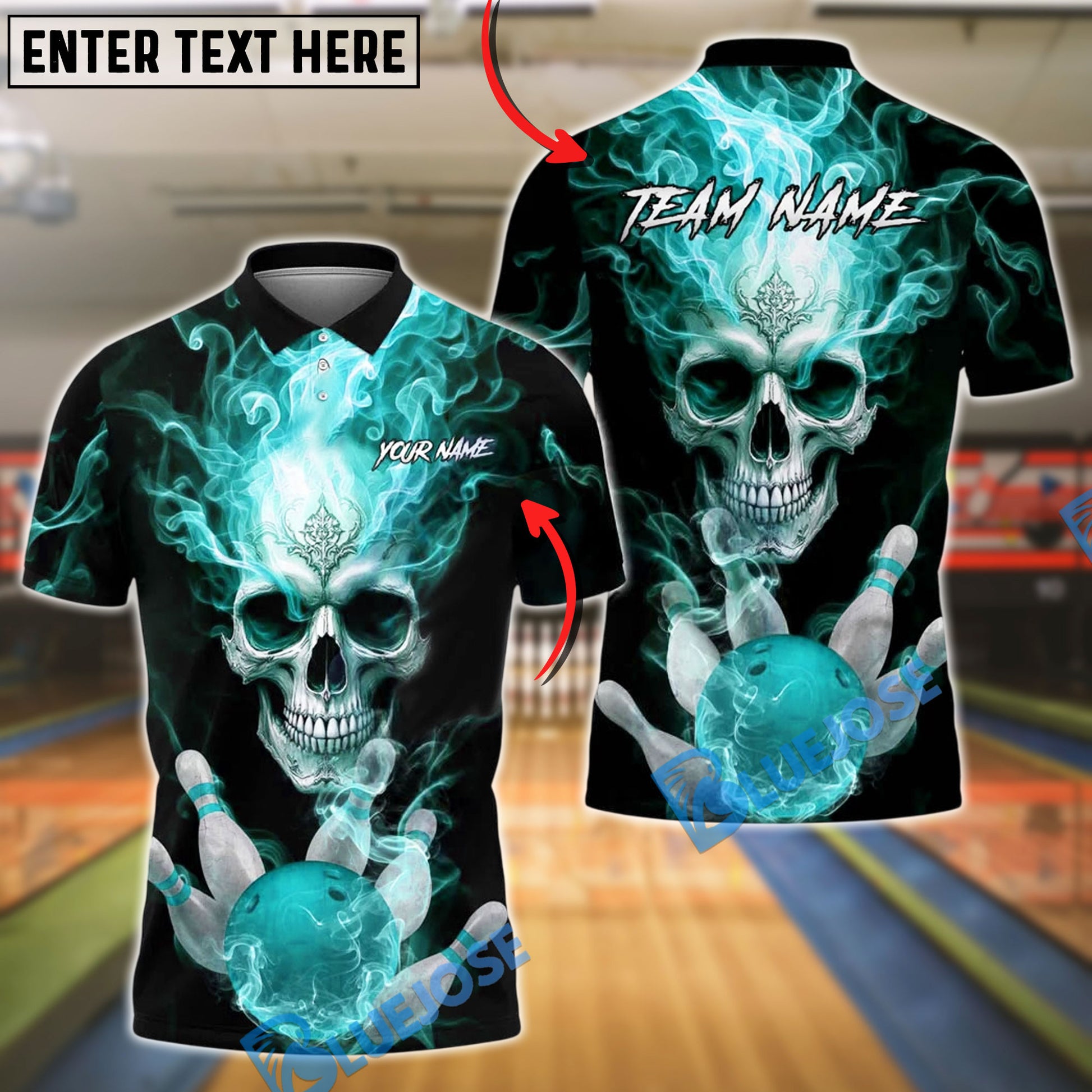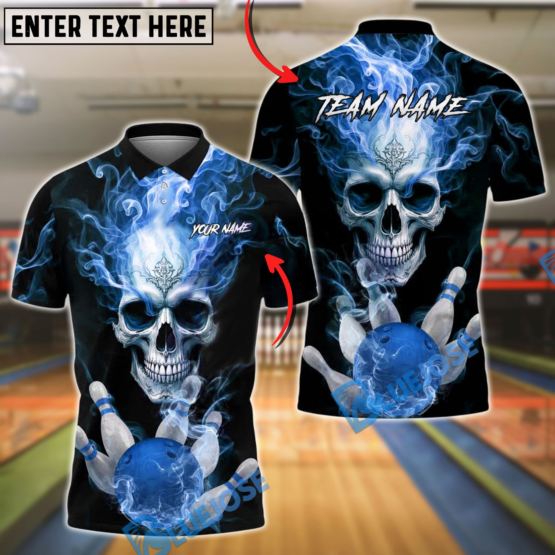 BlueJose Bowling And Pins Flaming King Smoke Skull Customized Name, Team Name 3D Shirt (4 Colors)
