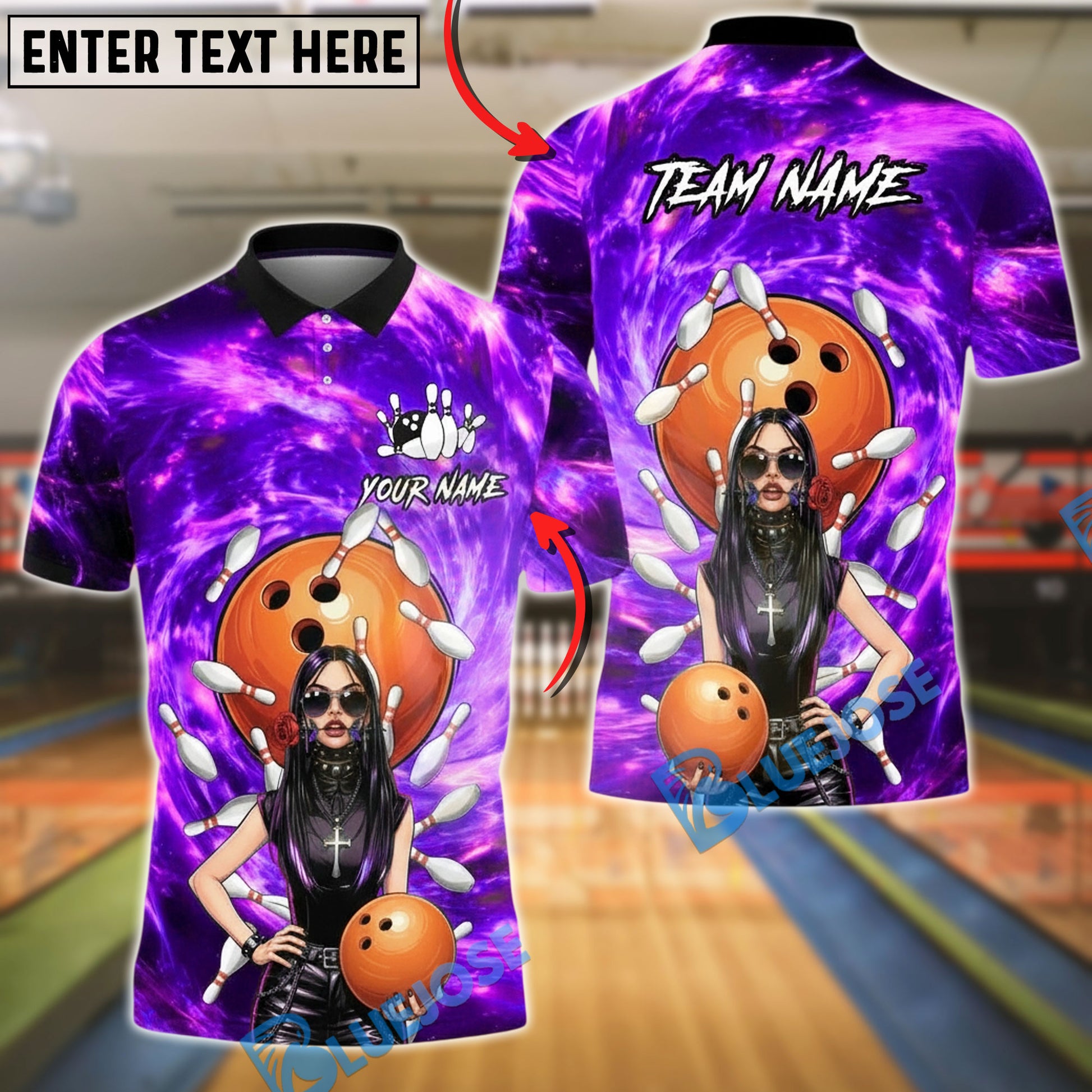 BlueJose Bowling And Pins Gothic Girl Orange Ball Blue Galaxy Background Customized Name, Team Name 3D Shirt (4 Colors)