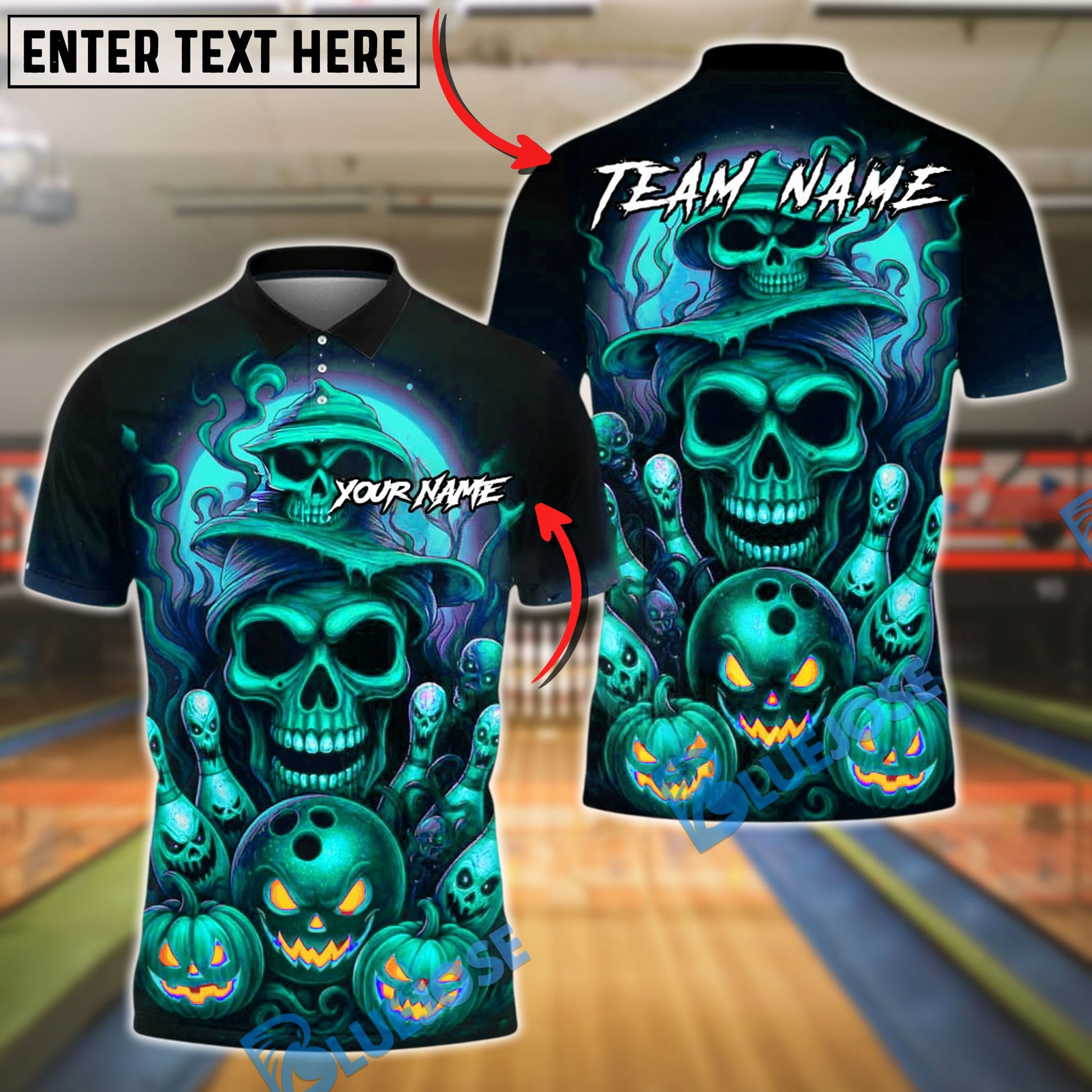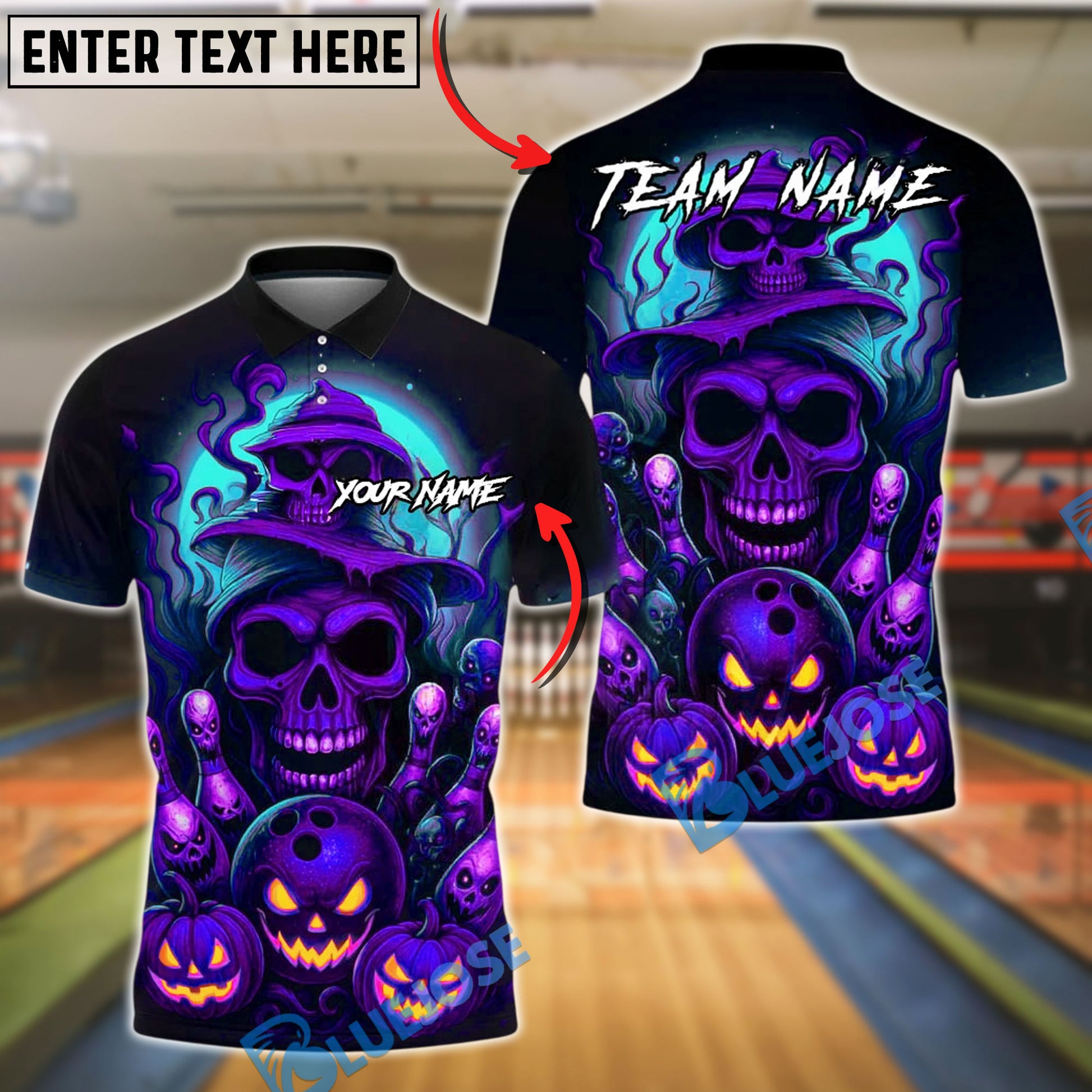 BlueJose Bowling And Pins Halloween Skull Neon Pumpkin Ghost Pins Customized Name, Team Name 3D Shirt (4 Colors)