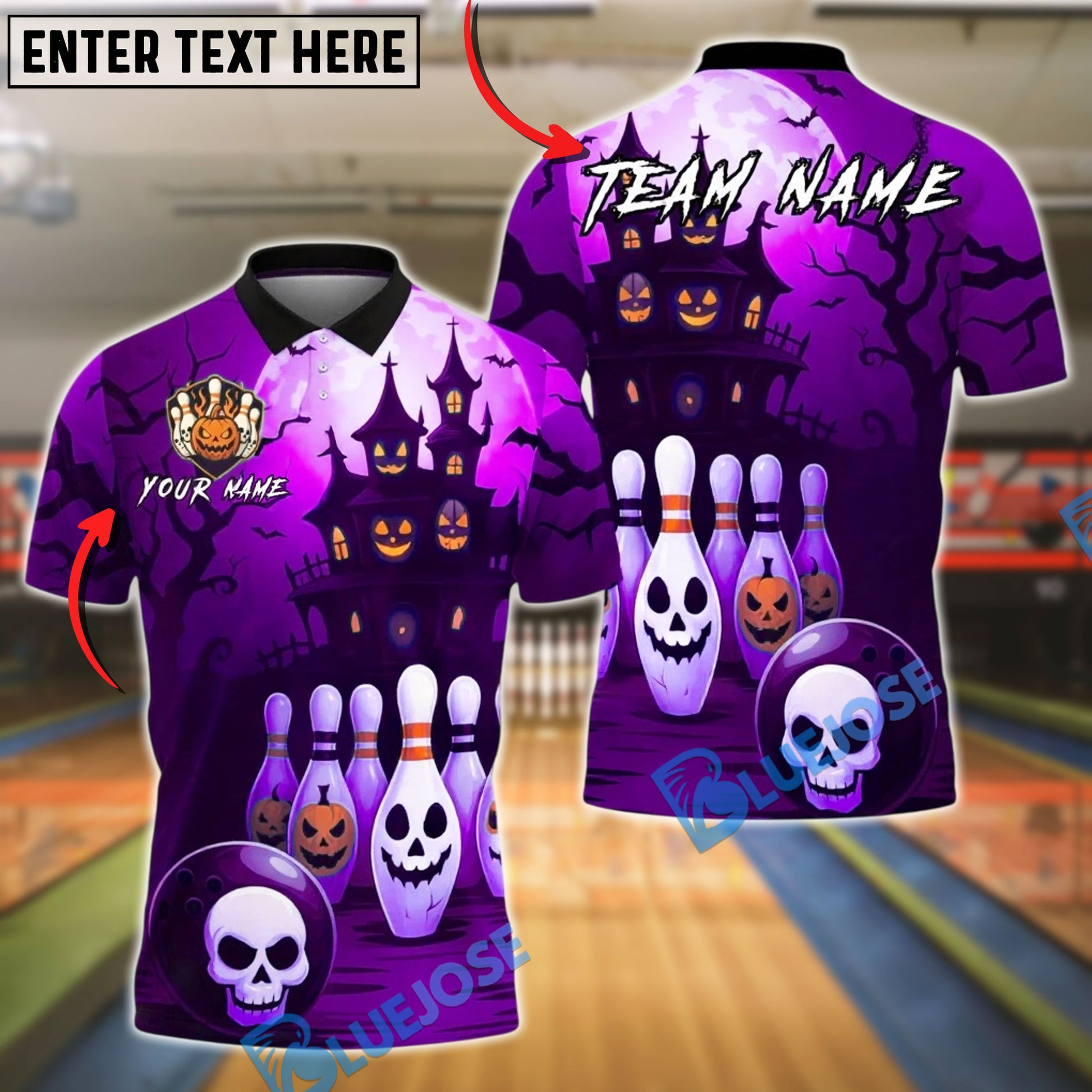 BlueJose Bowling And Pins Haunted House Skull Pins Pumpkin Ball Halloween Style Customized Name, Team Name 3D Shirt (4 Colors)
