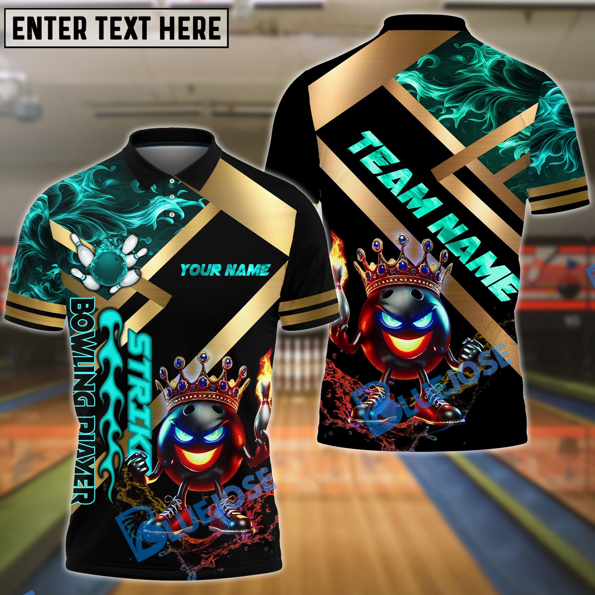 BlueJose Bowling And Pins King Fireball Gold Strike Design Customized Name, Team Name 3D Shirt (4 Colors)