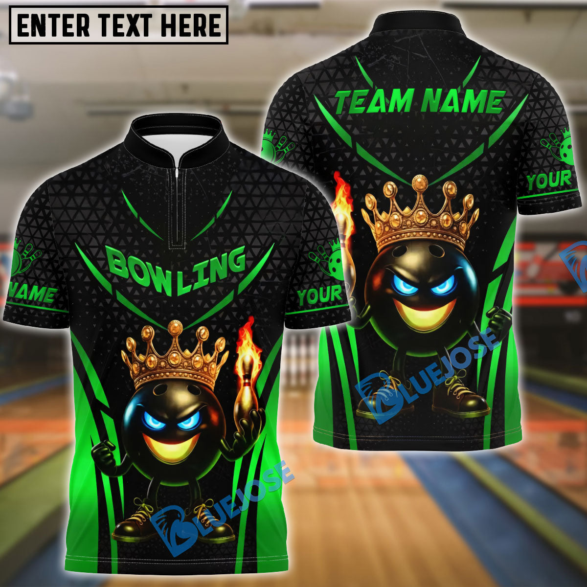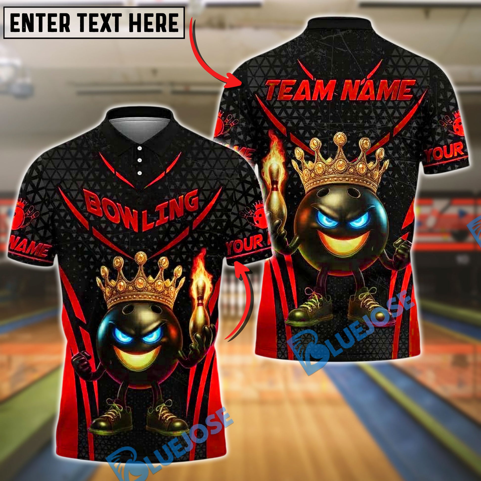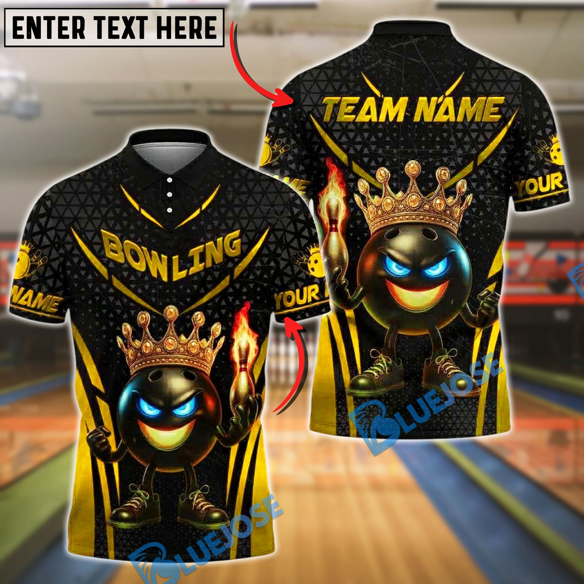 BlueJose Bowling And Pins King Flame Ball Black Gold Customized Name, Team Name 3D Shirt (4 Colors)