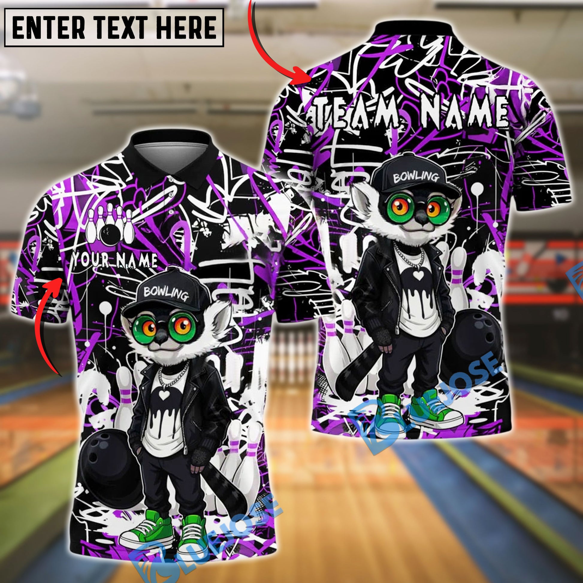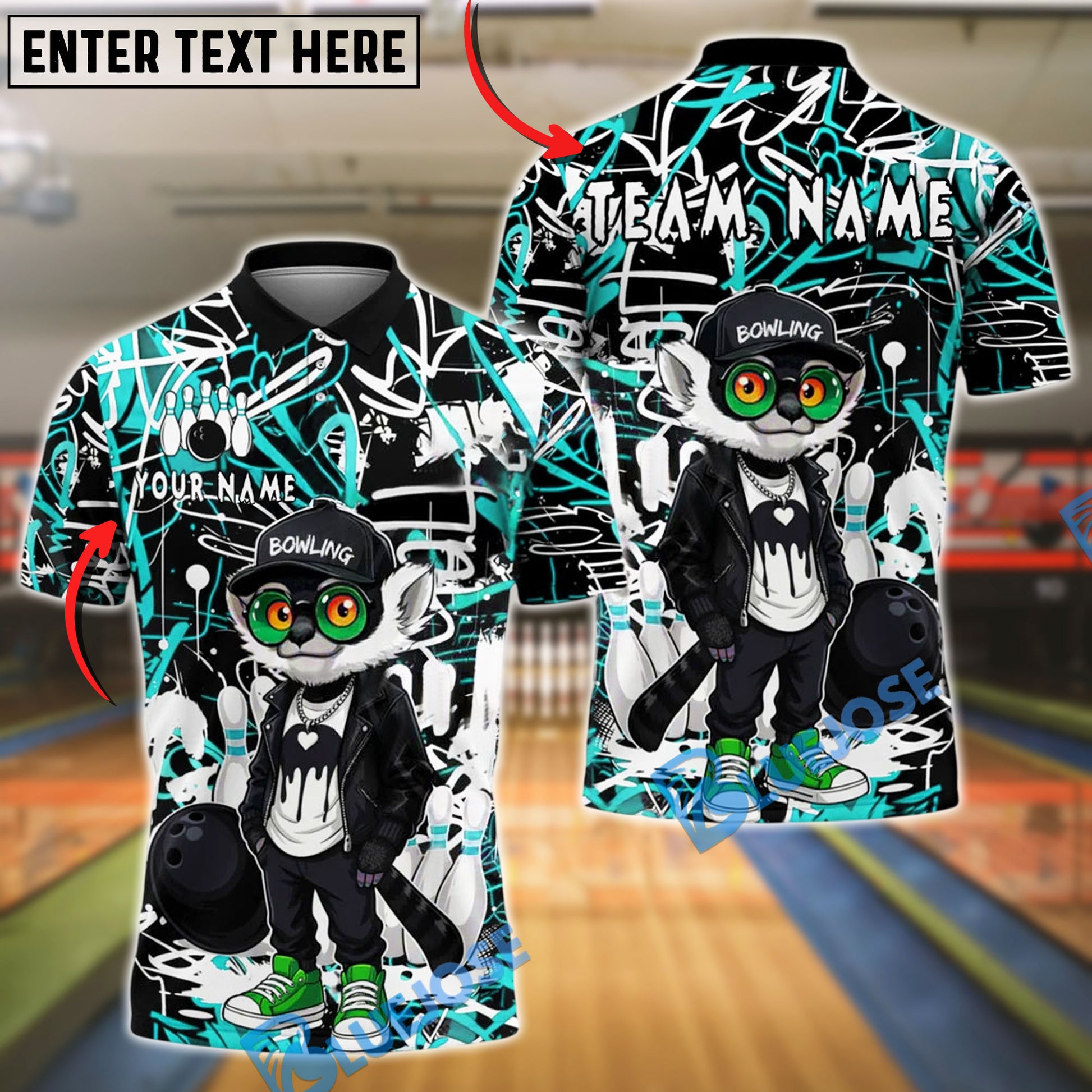 BlueJose Bowling And Pins Lemur Graffiti Leather Jacket Customized Name, Team Name 3D Shirt (4 Colors)