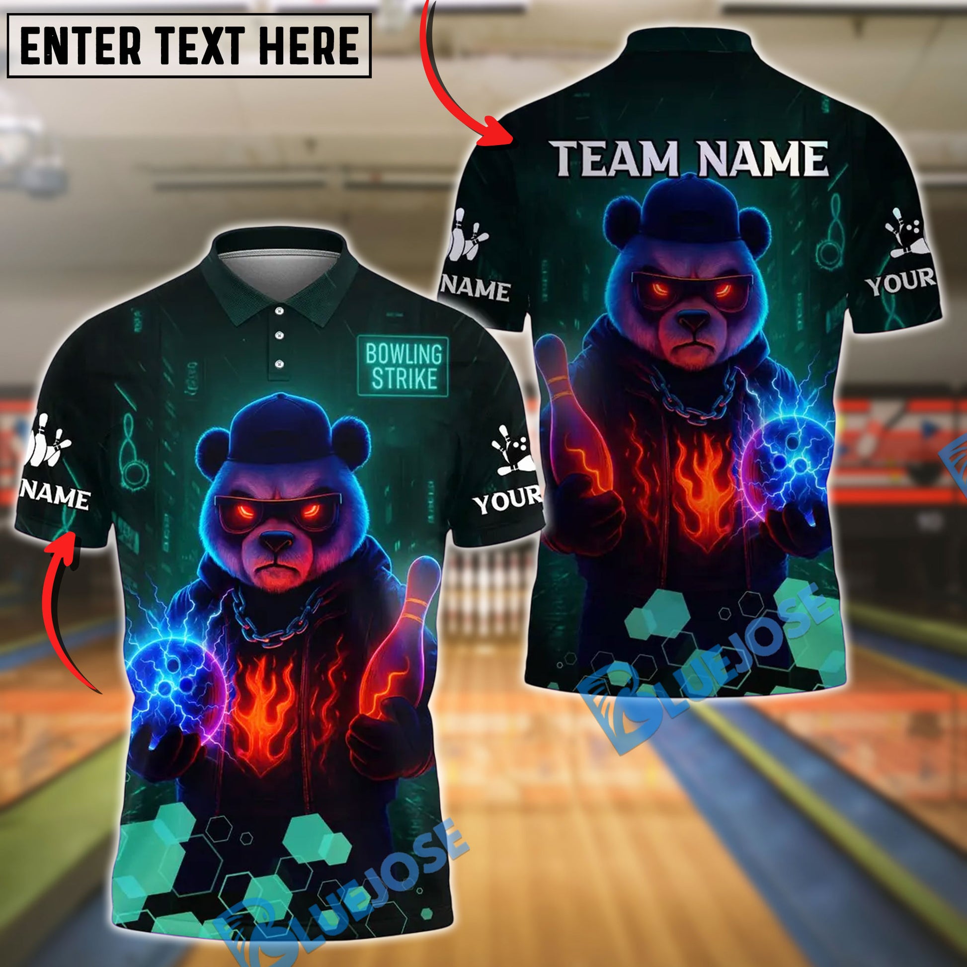 BlueJose Bowling And Pins Neon Flame Panda Customized Name, Team Name 3D Shirt (4 Colors)