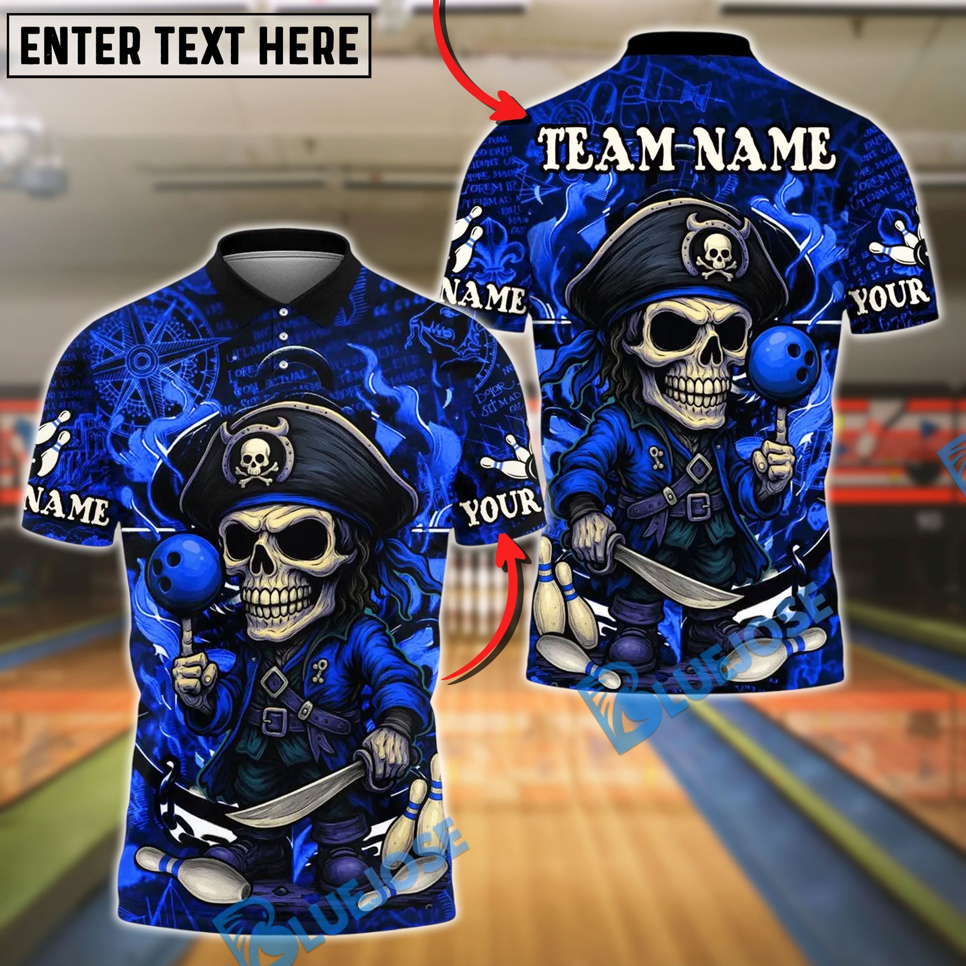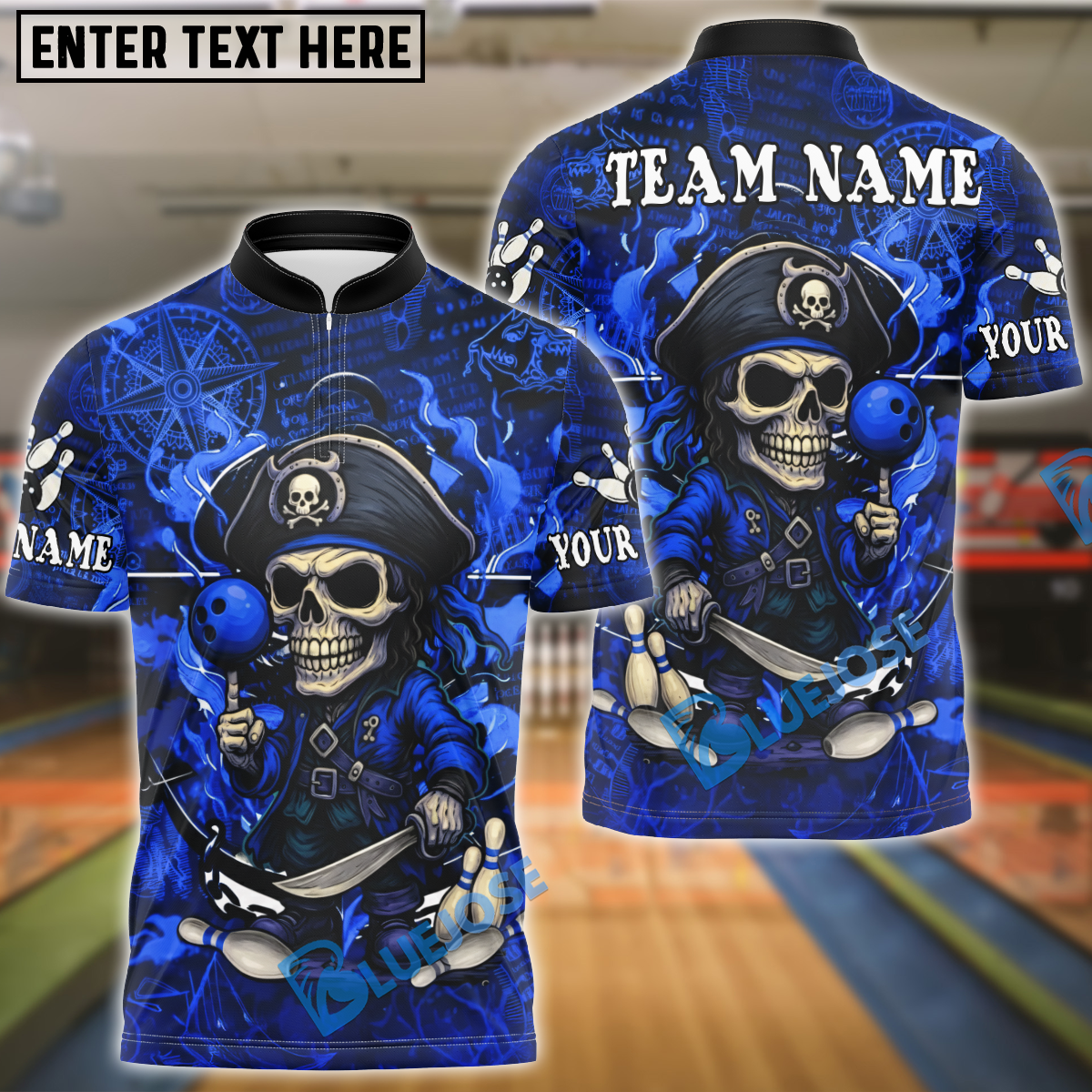 BlueJose Bowling And Pins Pirate Captain Skeleton Design Customized Name, Team Name 3D Shirt (4 Colors)
