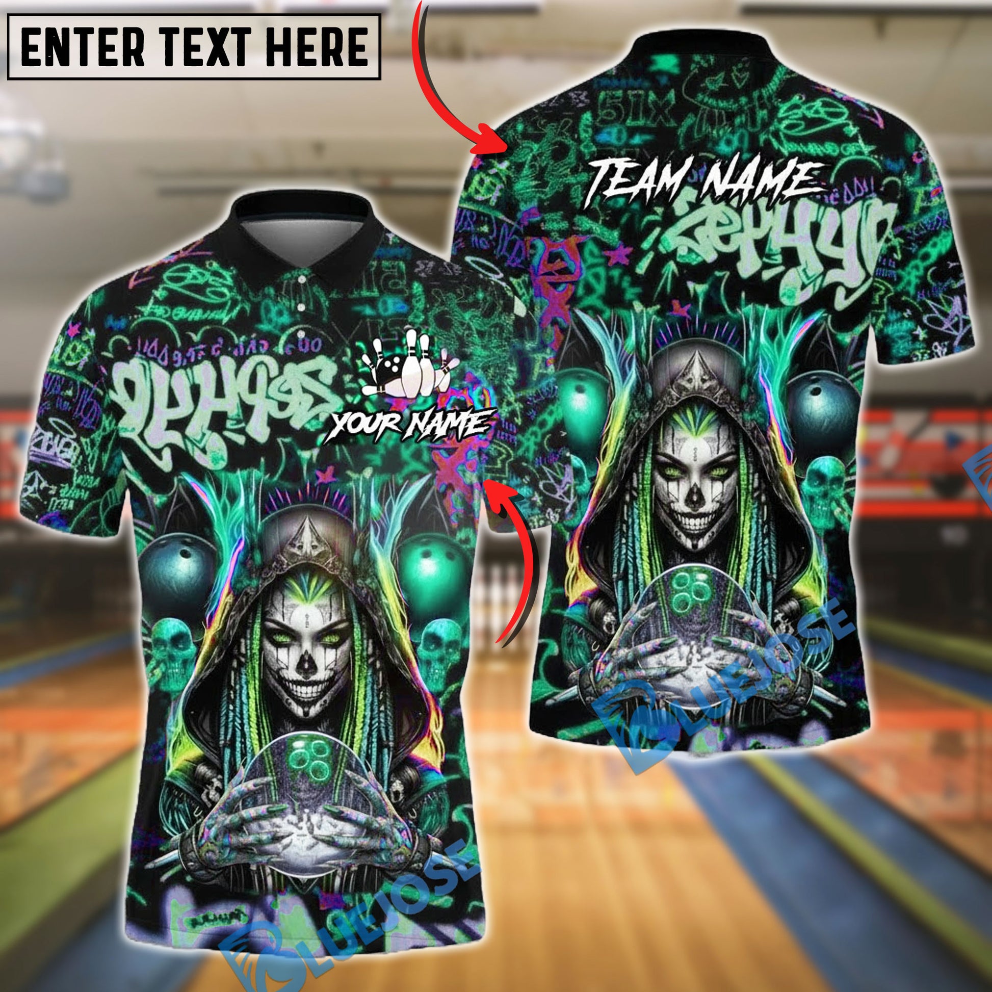 BlueJose Bowling And Pins Reaper Neon Graffiti Skull Girl Customized Name, Team Name 3D Shirt (4 Colors)