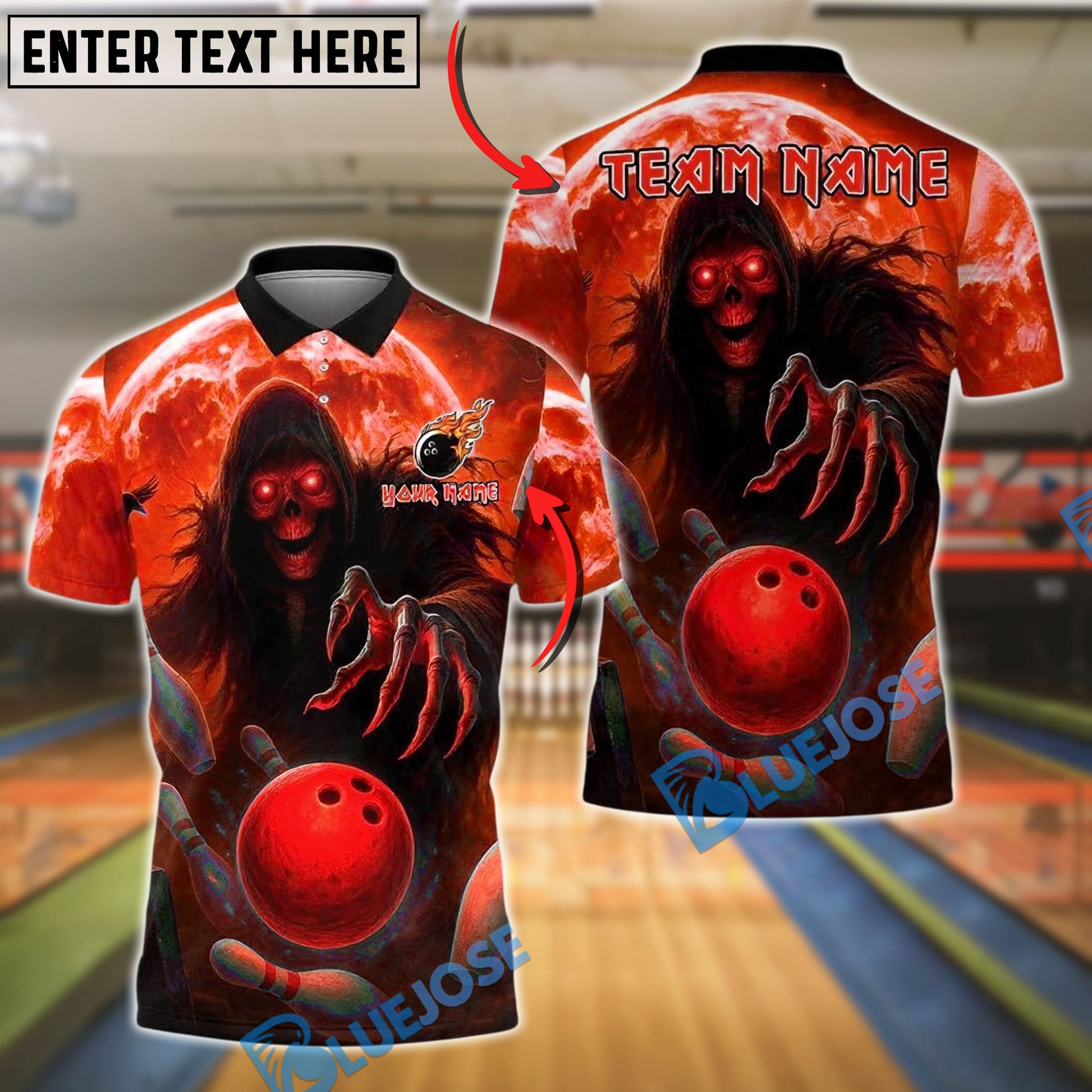 BlueJose Bowling And Pins Reaper Red Flame Eyes Customized Name, Team Name 3D Shirt (4 Colors)
