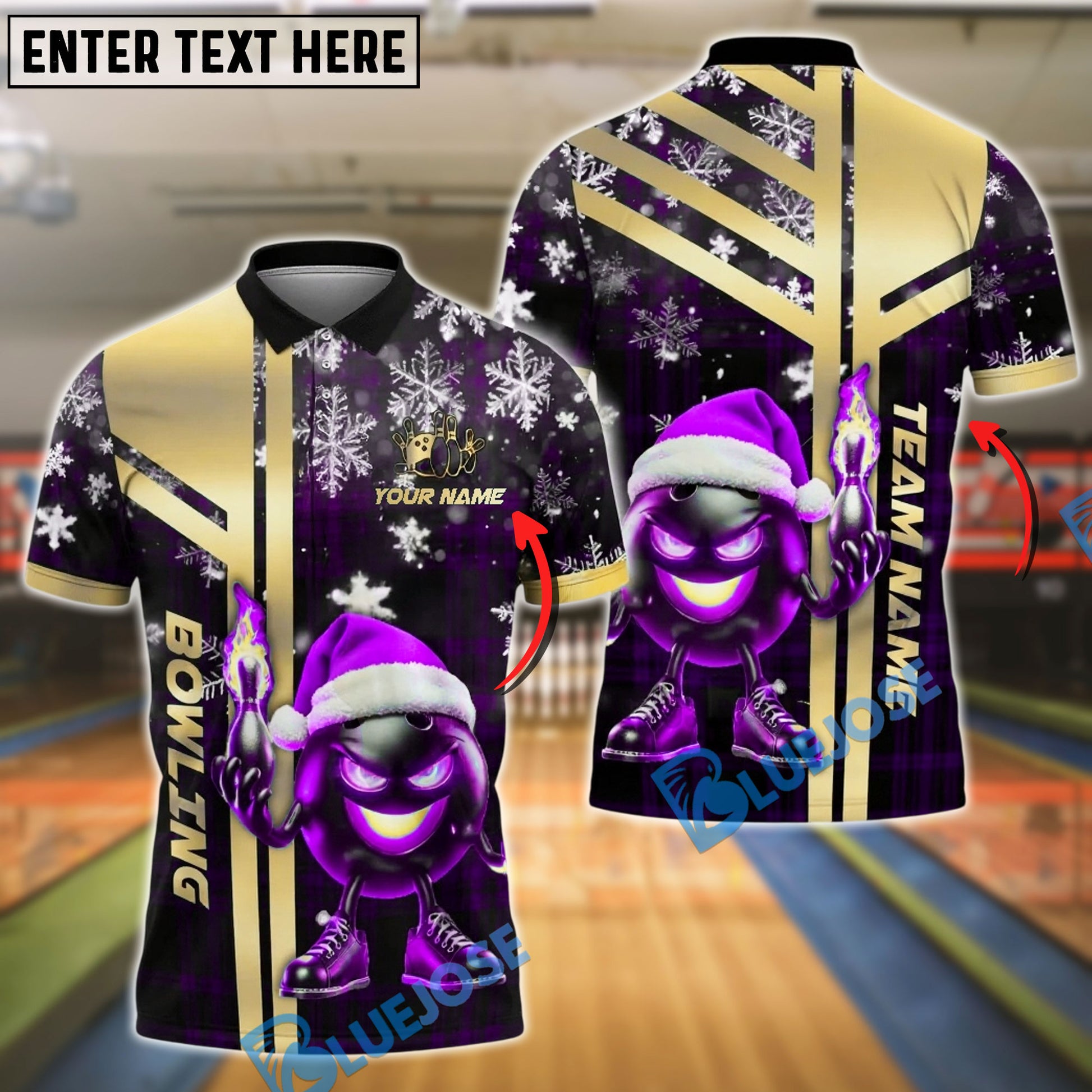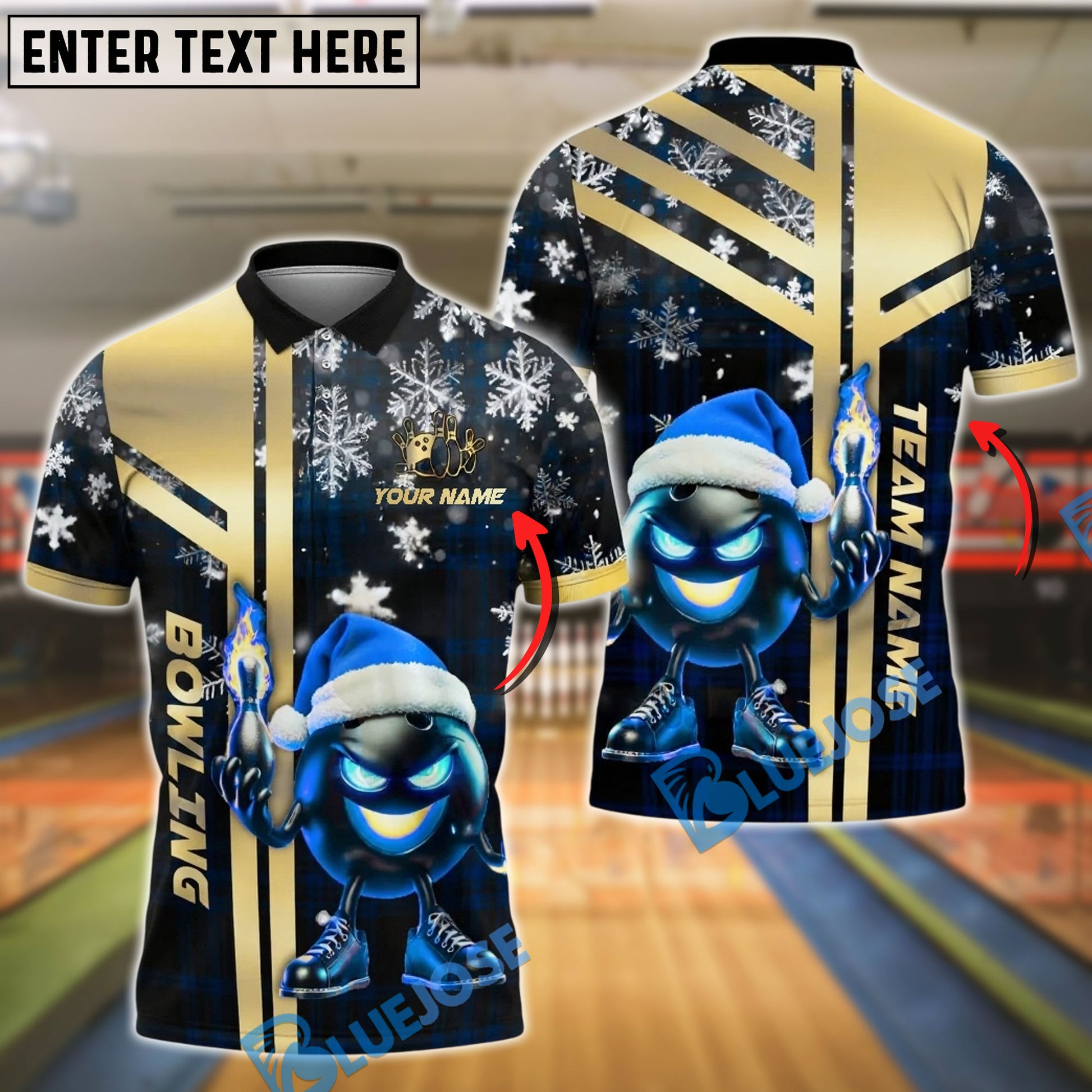 BlueJose Bowling And Pins Santa Flame Gold Black Customized Name, Team Name 3D Shirt (4 Colors)