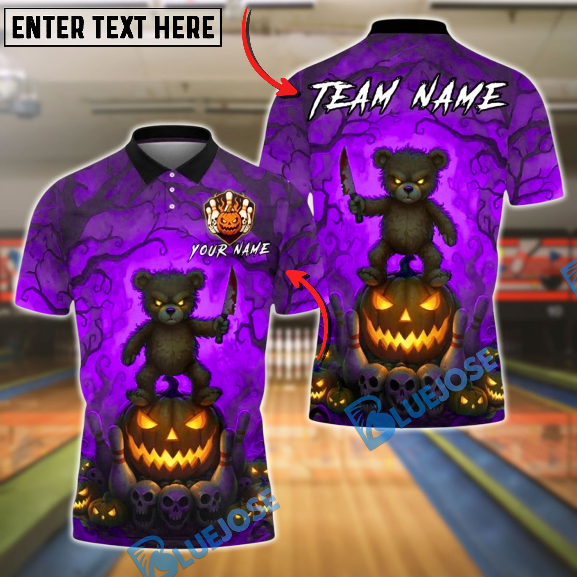 BlueJose Bowling And Pins Scary Teddy Bear Knife Pumpkin Ball Creepy Forest Halloween Customized Name, Team Name 3D Shirt (4 Colors)