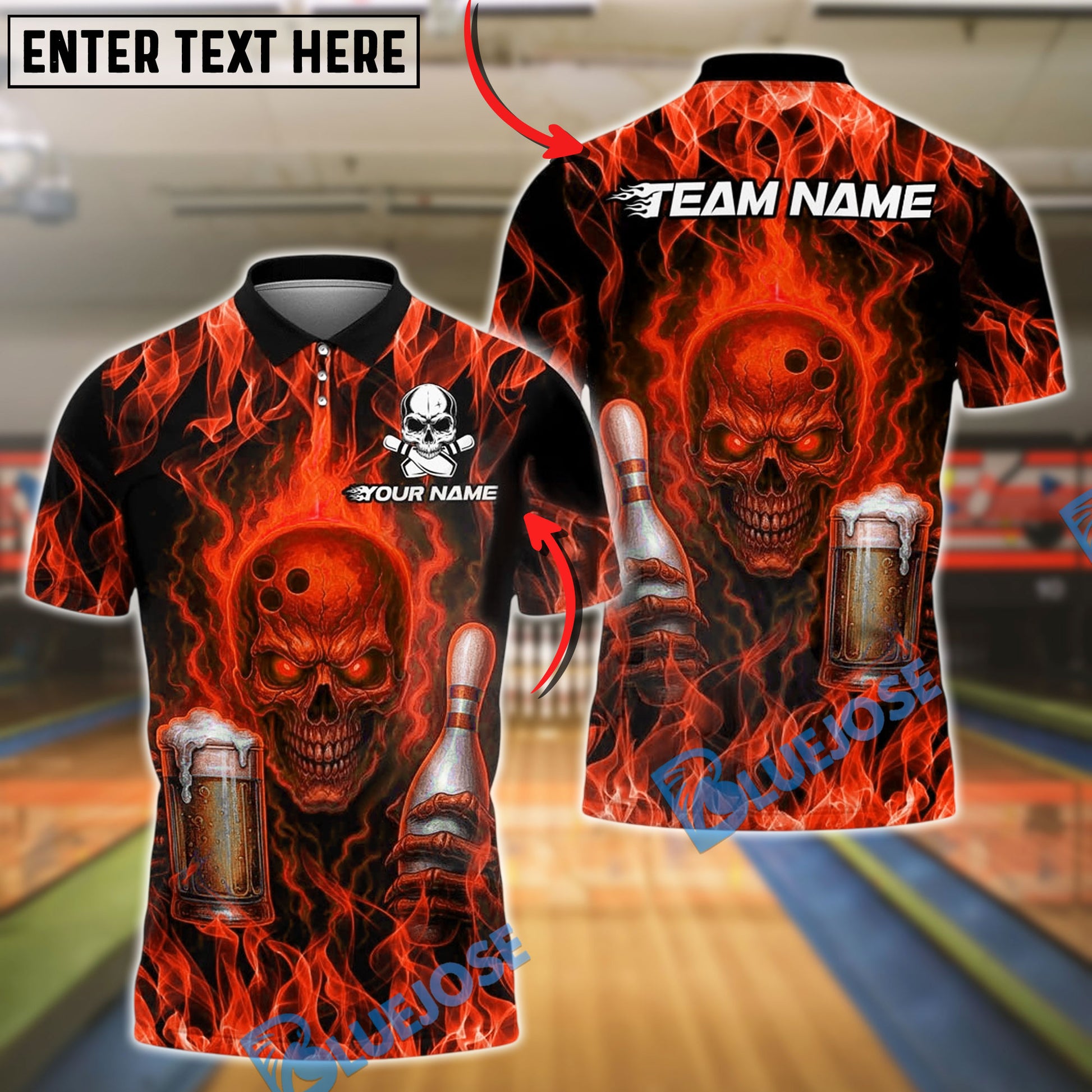 BlueJose Bowling And Pins Skull Flame Beer Customized Name, Team Name 3D Shirt (4 Colors)