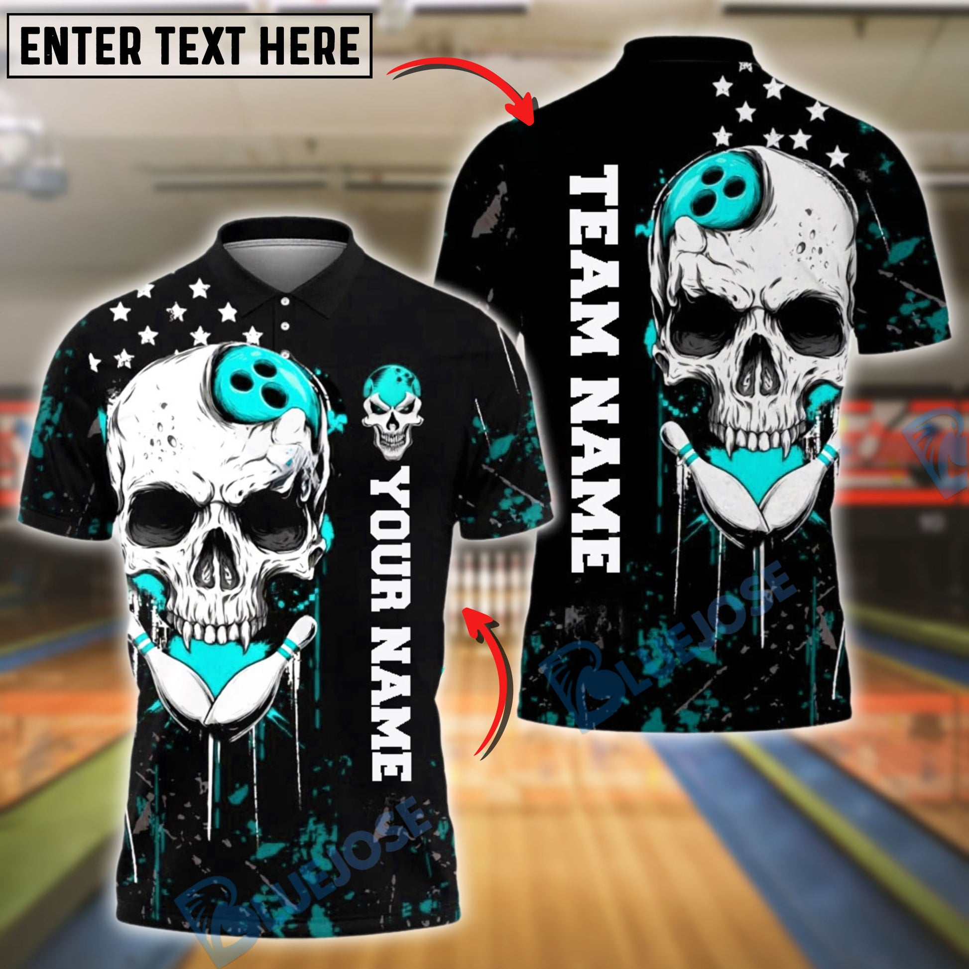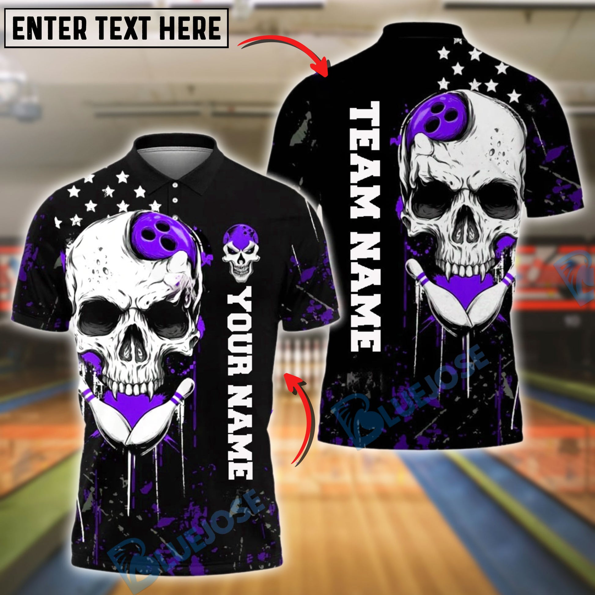 BlueJose Bowling And Pins Skull & Purple Grunge Design Customized Name, Team Name 3D Shirt (4 Colors)